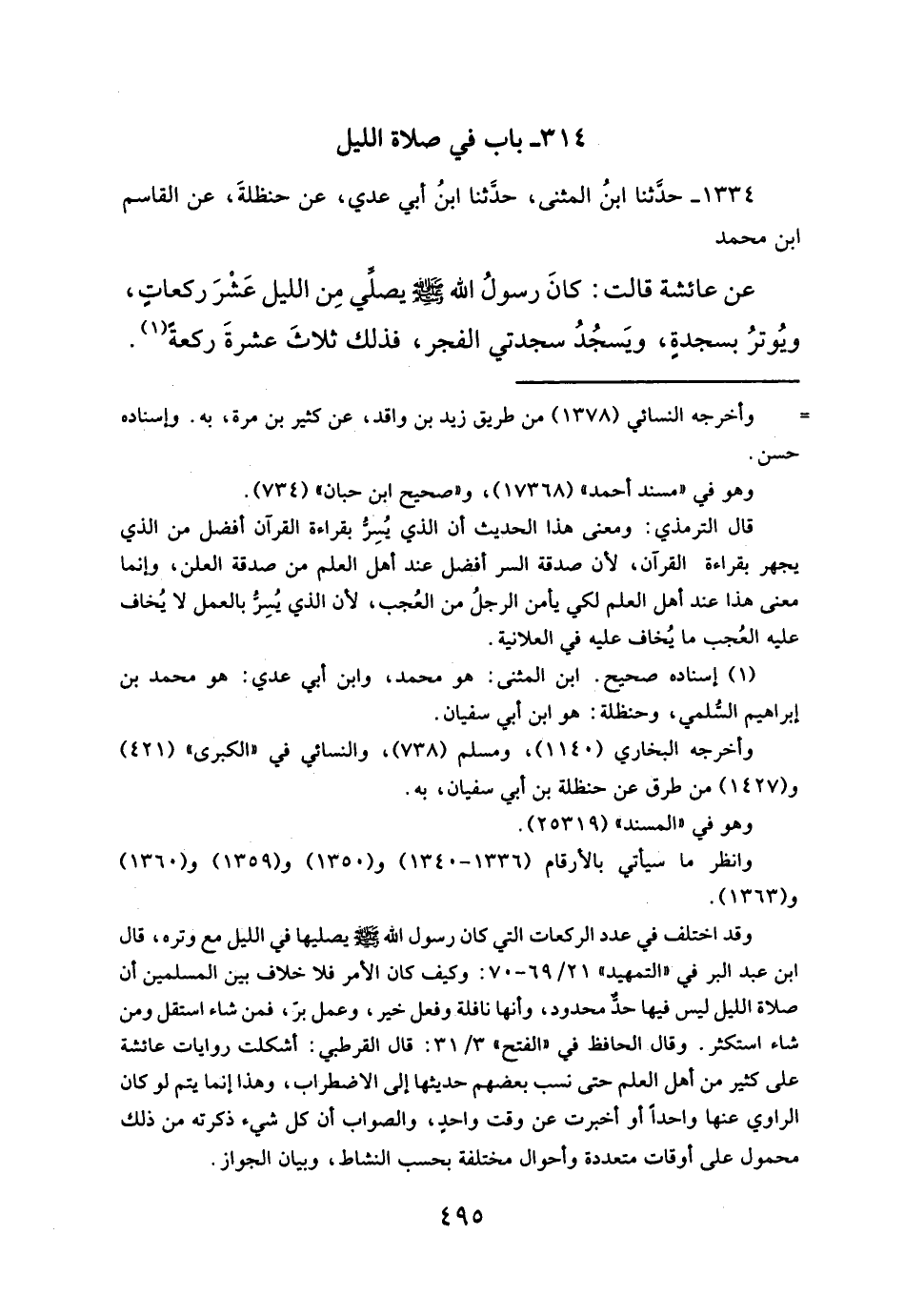 وقد اختلف في عدد الركعات التي كان رسول الله - صلَّى الله عليه وسلم - يصليها في الليل مع وتره، قال ابن عبد البر في "التمهيد" ٢١/ ٦٩ - ٧٠: وكيف كان الأمر فلا خلاف بين المسلمين أن صلاة الليل ليس فيها حدٌ محدود، وأنها نافلة وفعل خير، وعمل برّ، فمن شاء استقل ومن شاء استكثر. وقال الحافظ في "الفتح" ٣/ ٣١: قال القرطبي: أشكلت روايات عائشة على كثير من أهل العلم حتى نسب بعضهم حديثها إلى الاضطراب، وهذا إنما يتم لو كان الراوي عنها واحداً أو أخبرت عن وقت واحدٍ، والصواب أن كل شيء ذكرته من ذلك محمول على أوقات متعددة وأحوال مختلفة بحسب النشاط، وبيان الجواز.