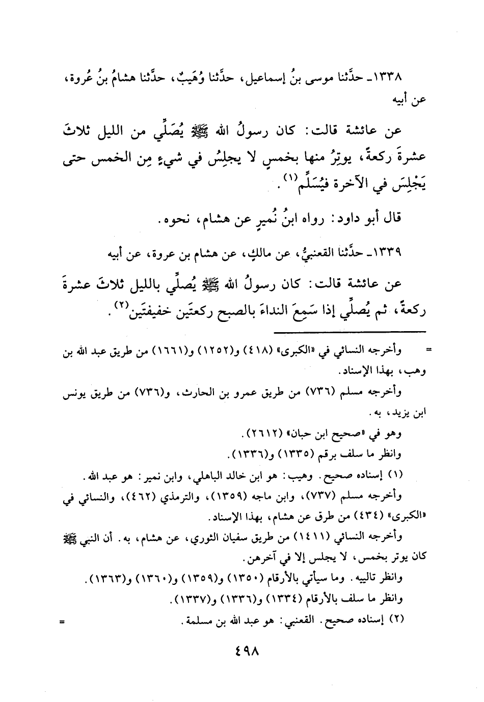١٣٣٨ - حدَّثنا موسى بنُ إسماعيل، حدَّثنا وُهَيب، حدَّثنا هشامُ بنُ عُروة، عن أبيه عن عائشة قالت: كان رسول الله - صلَّى الله عليه وسلم - يصَلِّي من الليل ثلاثَ عشرةَ ركعةً، يؤير منها بخمسٍ لا يجلِسُ في شيءٍ مِن الخمس حتى يَجْلِسَ في الآخرة فيُسَلِّم (¬١). قال أبو داود: رواه ابن نُميرٍ عن هشام، نحوه.