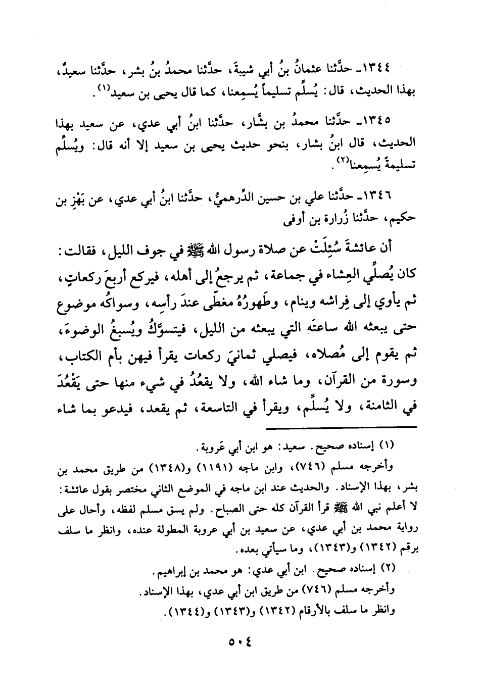 ١٣٤٤ - حدَّثنا عثمانُ بنُ أبي شيبةَ، حدَّثنا محمدُ بنُ بشر، حدَّثنا سعيدٌ، بهذا الحديث، قال: يُسلِّم تسليماً يُسمِعنا، كما قال يحيى بن سعيد (¬١).