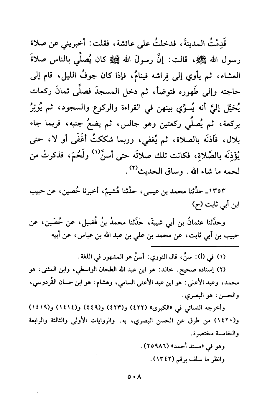 قَدِمْتُ المدينةَ، فدخلتُ على عائشة، فقلت: أخبريني عن صلاة رسول الله - صلَّى الله عليه وسلم -، قالت: إنَّ رسولَ الله - صلَّى الله عليه وسلم - كان يُصلّي بالناس صلاةَ العشاء، ثم يأوي إلى فِراشه فينامُ، فإذا كان جوفُ الليل، قام إلى حاجته وإلى طَهوره فتوضأ، ثم دخل المسجدَ فصلَّى ثمانَ ركعات يُخيَّل إليَّ أنه يُسوِّي بينهن في القراءة والركوع والسجود، ثم يُوترُ بركعة، ثم يُصلِّي ركعتين وهو جالس، ثم يضعُ جنبه، فربما جاء بلال، فآذنَه بالصلاة، ثم يُغفي، وربما شككتُ أغَفَى أو لا، حتى يُؤْذِنَه بالصَلاةِ، فكانت تلك صلاتَه حتى أسنَّ (¬١) ولَحُمَ، فذكرتْ من لحمه ما شاء الله. وساق الحديث (¬٢).