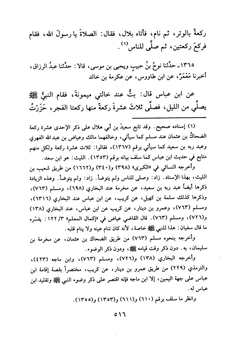 (¬١) إسناده صحيح. وقد تابع سعيدَ بن أبي هلال على ذكر الإحدى عشرة ركعة الضحاكُ بن عثمان عند مسلم كما سيأتي، وخالفهما مالك وعياض بن عبد الله الفهري وعبد ربه بن سعيد كما سيأتي برقم (١٣٦٧)، فقالوا: ثلاث عشرة ركعة ولكل منهم متابع في حديث ابن عباس كما سلف بيانه برقم (١٣٥٣). الليث: هو ابن سعد.