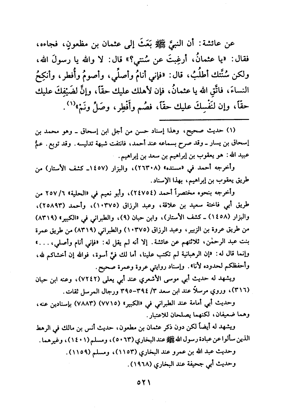 عن عائشة: أن النبيَّ - صلَّى الله عليه وسلم - بَعَثَ إلى عثمان بن مظعونٍ، فجاءه، فقال: "يا عثمانُ، أرغِبتَ عن سُنتي؟ "قال: لا والله يا رسولَ الله، ولكن سُنَّتك أطلُبُ، قال: " فإني أنامُ وأصلِّي، وأصومُ وأُفطر، وأنكِحُ النساءَ، فاتَّقِ الله يا عثمانُ، فإن لأهلك عليك حقّاَ، وإنَّ لضَيفِكَ عليك حقاَ، وإن لنَفسِكَ عليك حقّاً، فصُم وأَفطِر، وصَلِّ ونَمْ" (¬١).