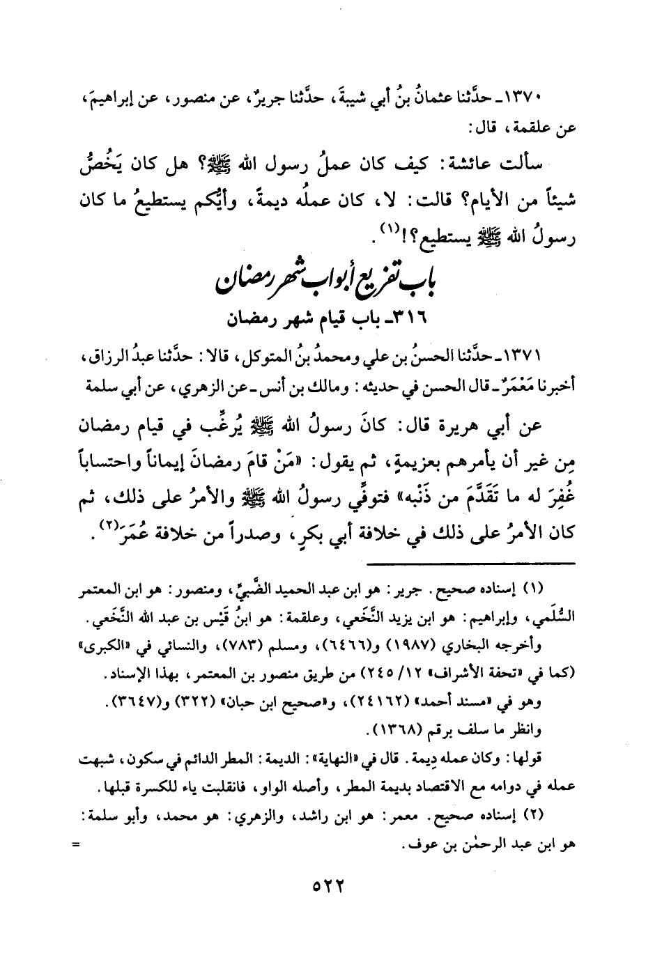 عن أبي هريرة قال: كانَ رسولُ الله - صلَّى الله عليه وسلم - يُرغِّب في قيام رمضان مِن غير أن يأمرهم بعزيمةِ، ثم يقول: "مَنْ قامَ رمضانَ إيماناً واحتساباً غُفِرَ له ما تَقَدَمَ من ذَنْبه" فتوفِّي رسولُ الله - صلَّى الله عليه وسلم - والأمرُ على ذلك، ثم كان الأمرُ على ذلك في خلافة أبي بكرِ، وصدراً من خلافة عُمَرَ (¬٢).