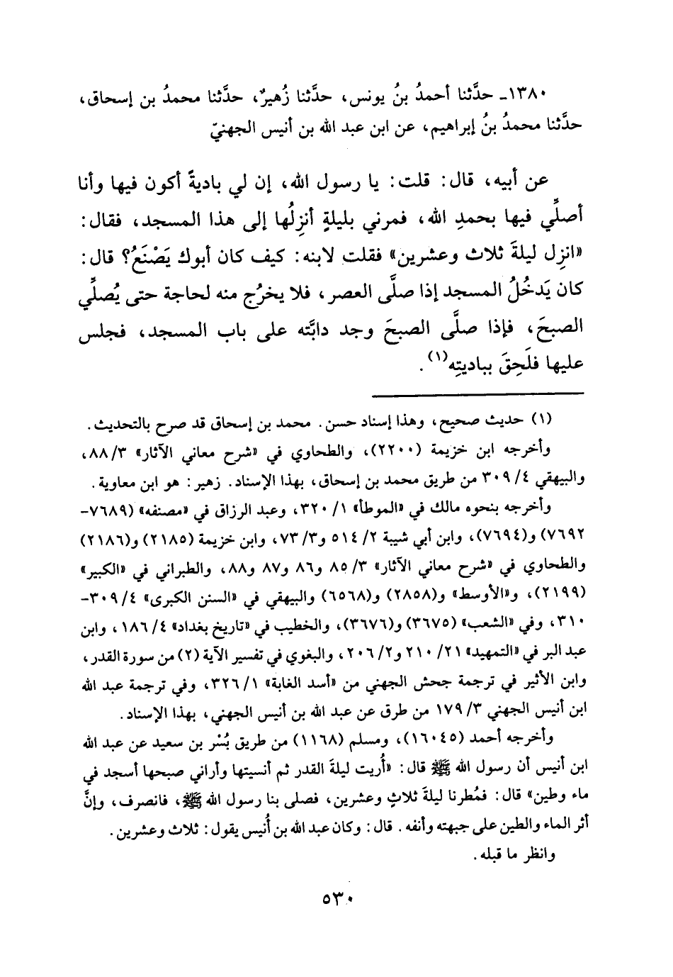 ابن أنيس أن رسول الله - صلَّى الله عليه وسلم - قال: "أُريت ليلةَ القدر ثم أنسيتها وأراني صبحها أسجد في ماء وطين" قال: فمُطرنا ليلةَ ثلاثِ وعشرين، فصلى بنا رسول الله - صلَّى الله عليه وسلم -، فانصرف، وإنَّ أثر الماء والطين على جبهته وأنفه. قال: وكان عبد الله بن أُنيس يقول: ثلاث وعشرين. وانظر ما قبله.