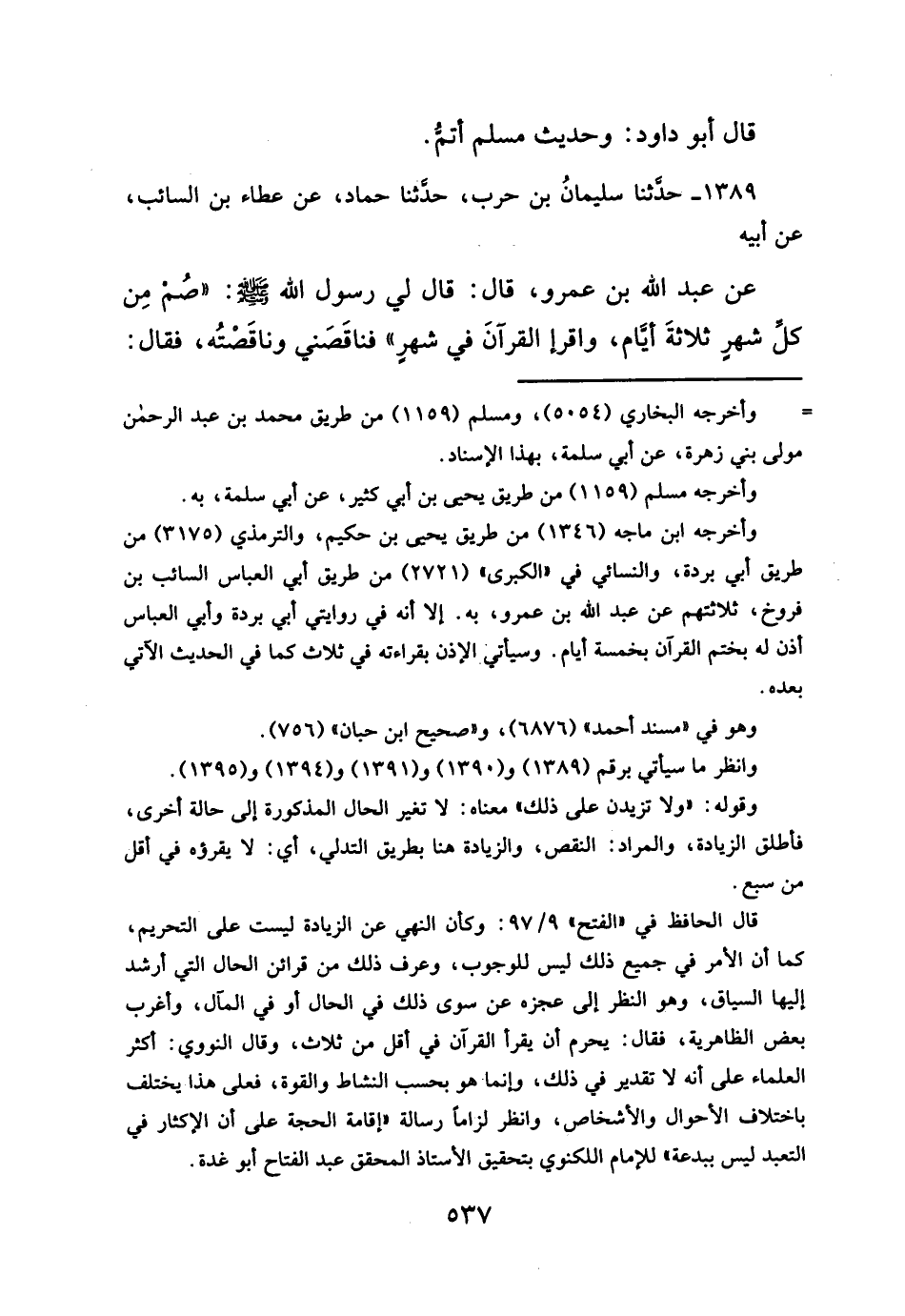 ١٣٨٩ - حدَّثنا سليمانُ بن حرب، حدَّثنا حماد، عن عطاء بن السائب، عن أبيه عن عبد الله بن عمرو، قال: قال لي رسول الله - صلَّى الله عليه وسلم -: "صُم مِن كلِّ شهرٍ ثلاثةَ أيام، واقرإ القرآنَ في شهرٍ" فناقَصَني وناقَصْتُه، فقال: