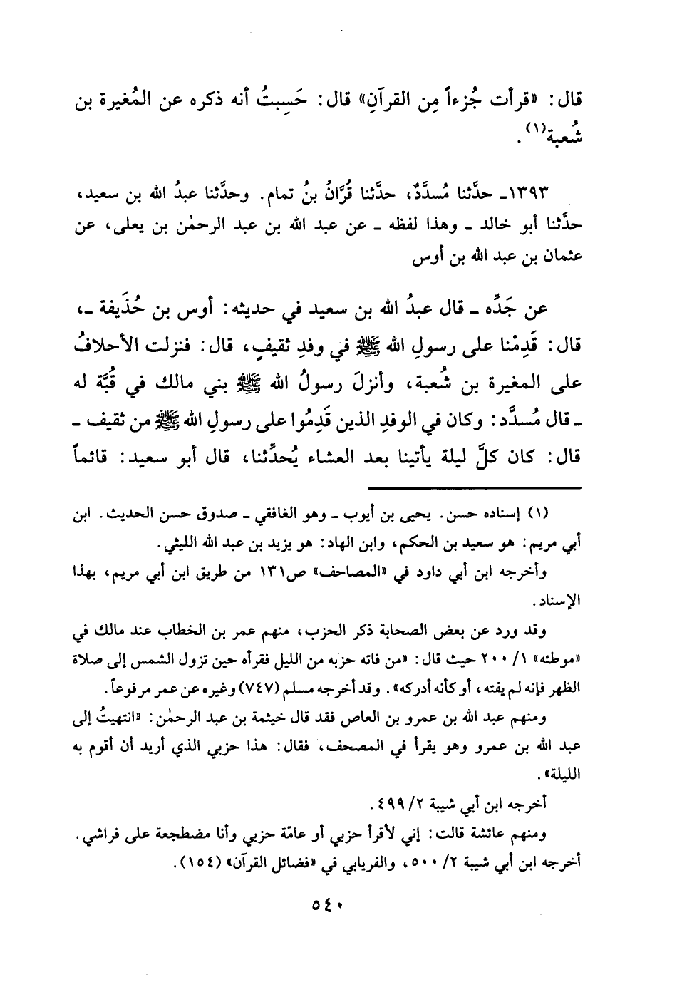 ١٣٩٣ - حدَّثنا مسدَّدٌ، حدَّثنا قُرَّانُ بنُ تمام. وحدَثنا عبدُ الله بن سعيد، حدَّثنا أبو خالد - وهذا لفظه - عن عبد الله بن عبد الرحمن بن يعلى، عن عثمان بن عبد الله بن أوس عن جَدّه - قال عبدُ الله بن سعيد في حديثه: أوس بن حُذَيفة -، قال: قَدِمْنا على رسولِ الله - صلَّى الله عليه وسلم - في وفدِ ثقيفٍ، قال: فنزلت الأحلافُ على المغيرة بن شُعبة، وأنزلَ رسولُ الله - صلَّى الله عليه وسلم - بني مالك في قُبَّة له قال مُسدَّد: وكان في الوفدِ الذين قَدِمُوا على رسولِ الله - صلَّى الله عليه وسلم - من ثقيف - قال: كان كلَّ ليلة يأتينا بعد العشاء يُحدّثنا، قال أبو سعيد: قائماً