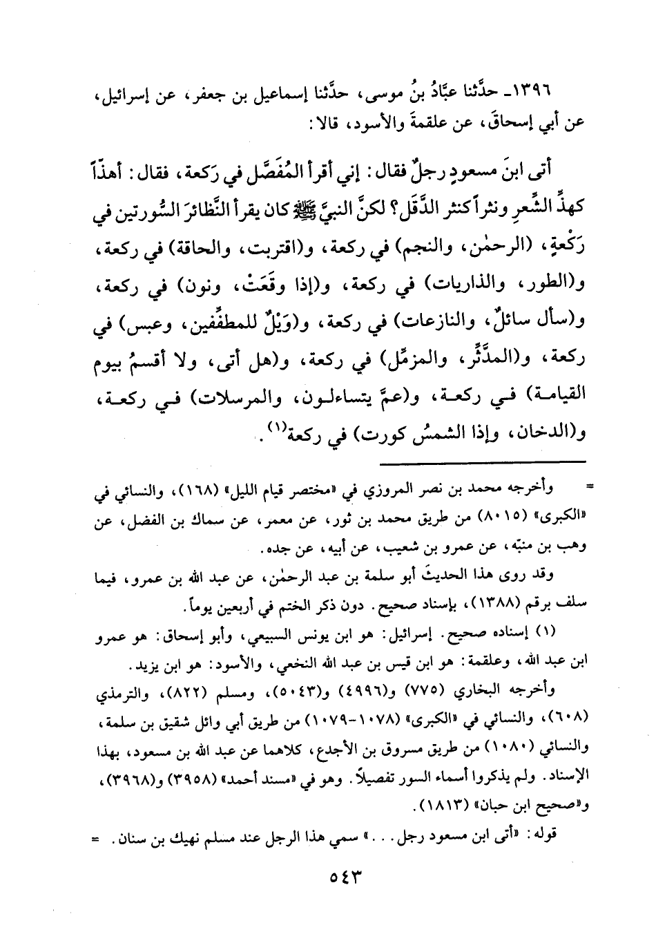 ١٣٩٦ - حدَّثنا عبّادُ بنُ موسى، حدَّثنا إسماعيل بن جعفر، عن إسرائيل، عن أبي إسحاقَ، عن علقمةَ والأسود، قالا: