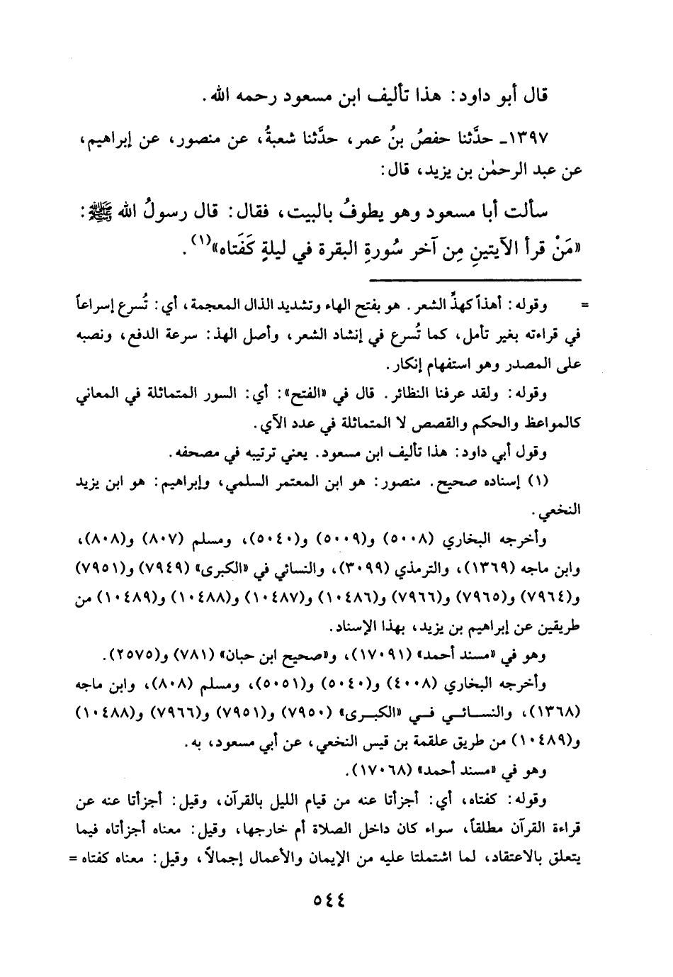 سألت أبا مسعود وهو يطوفُ بالبيت، فقال: قال رسولُ الله - صلَّى الله عليه وسلم -: "مَنْ قرأ الآيتينِ مِن آخر سُورةِ البقرة في ليلةِ كَفَتاه" (¬١).