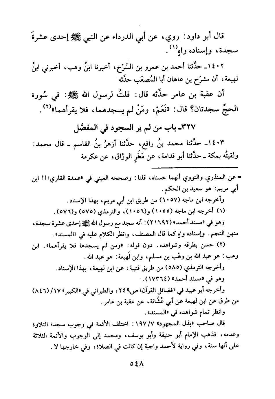 أن عقبة بن عامر حدَثه قال: قلتُ لرسول الله - صلَّى الله عليه وسلم -: في سُورة الحج سجدتان؟ قال: "نَعَمْ، ومَنْ لم يسجدهما، فلا يقرأهما" (¬٢).