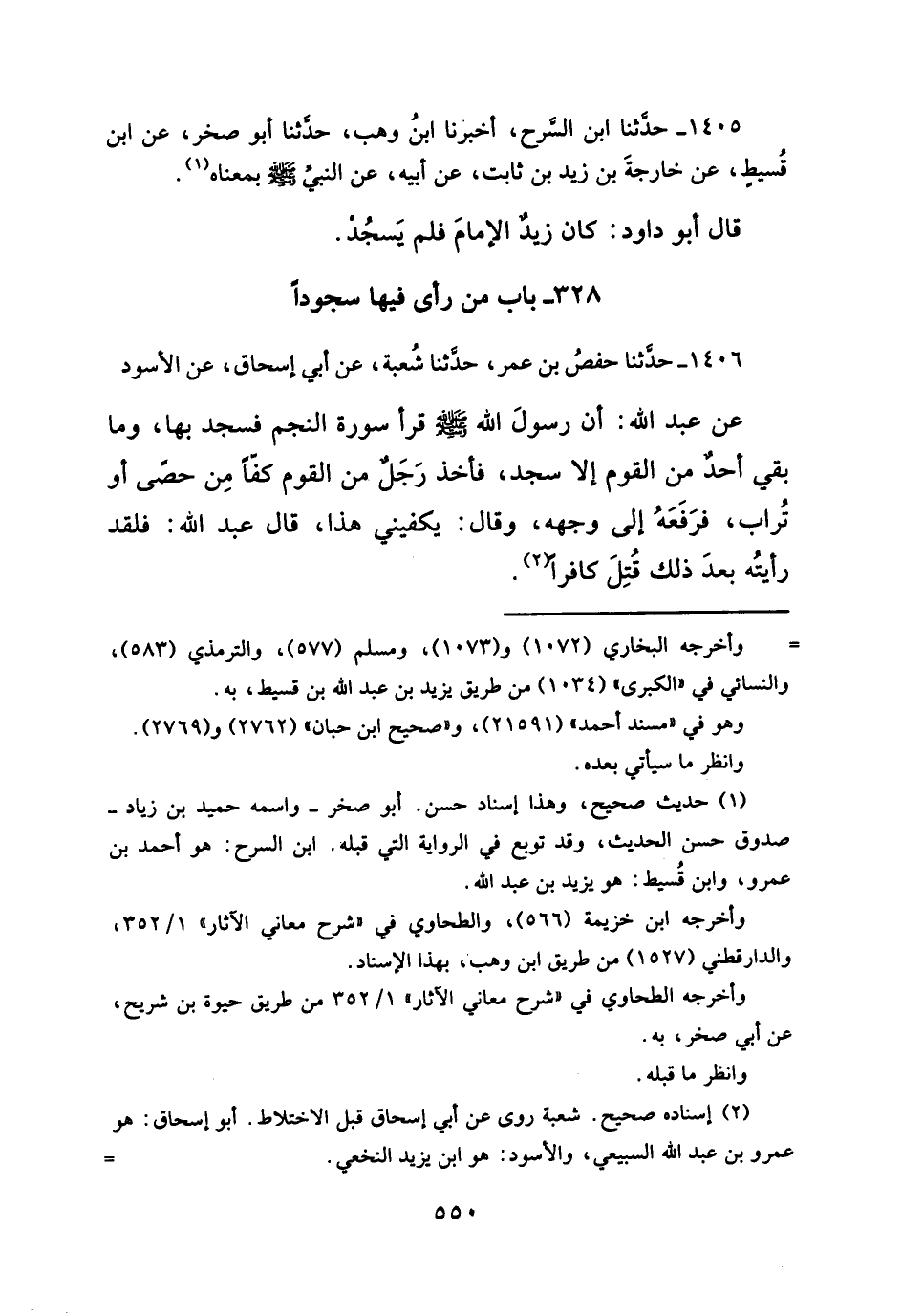 ١٤٠٦ - حدَّثنا حفصُ بن عمر، حدَّثنا شُعبة، عن أبي إسحاق، عن الأسود عن عبد الله: أن رسولَ الله - صلَّى الله عليه وسلم - قرأ سورة النجم فسجد بها، وما بقي أحدٌ من القوم إلا سجد، فأخذ رَجَلٌ من القوم كفّاً مِن حصَى أو تُراب، فرَفَعَهُ إلى وجهه، وقال: يكفيني هذا، قال عبد الله: فلقد رأيتُه بعدَ ذلك قُتِلَ كافراً (¬٢).