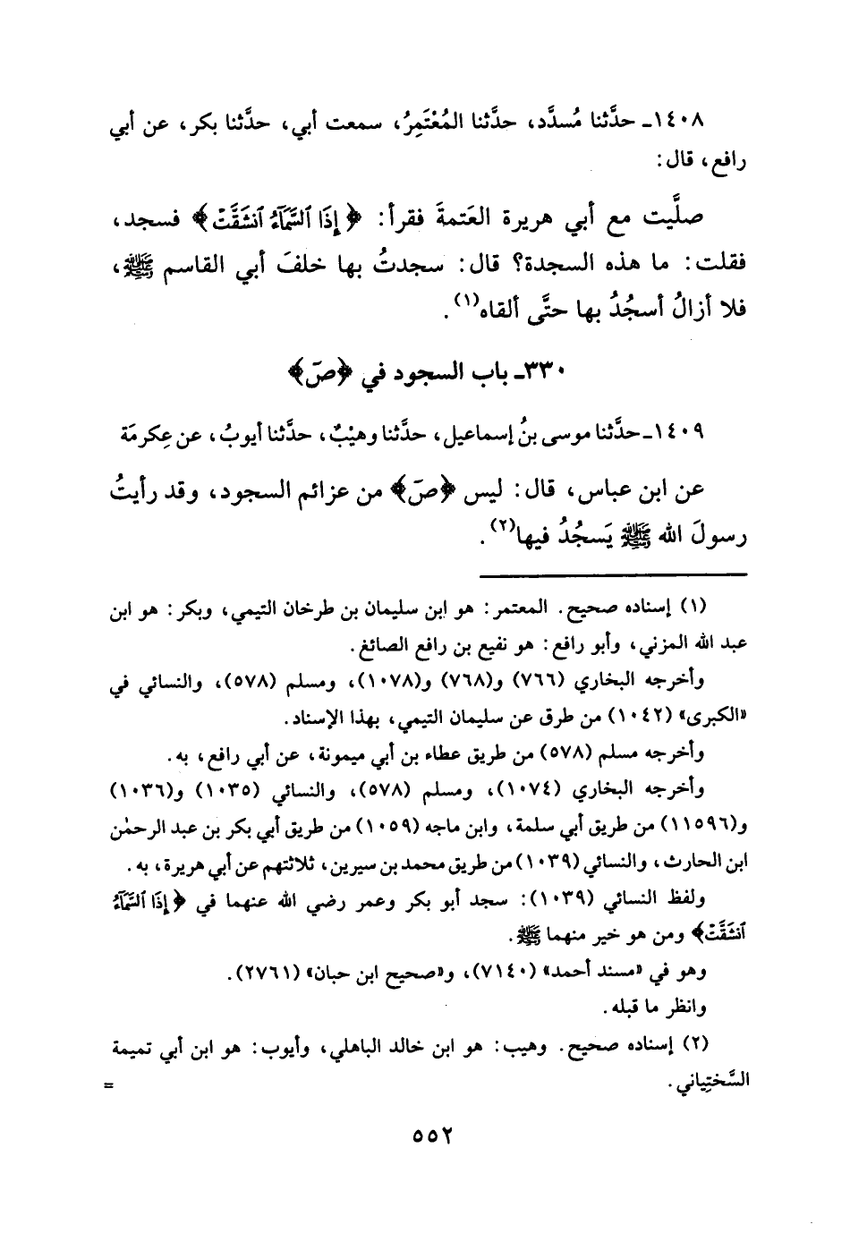 ١٤٠٩ - حدَّثنا موسى بنُ اسماعيل، حدَّثنا وهيب، حدَّثنا أيوبُ، عن عِكرمَة عن ابن عباس، قال: ليس {ص} من عزائم السجود، وقد رأيتُ رسولَ الله - صلَّى الله عليه وسلم - يَسجُدُ فيها (¬٢).