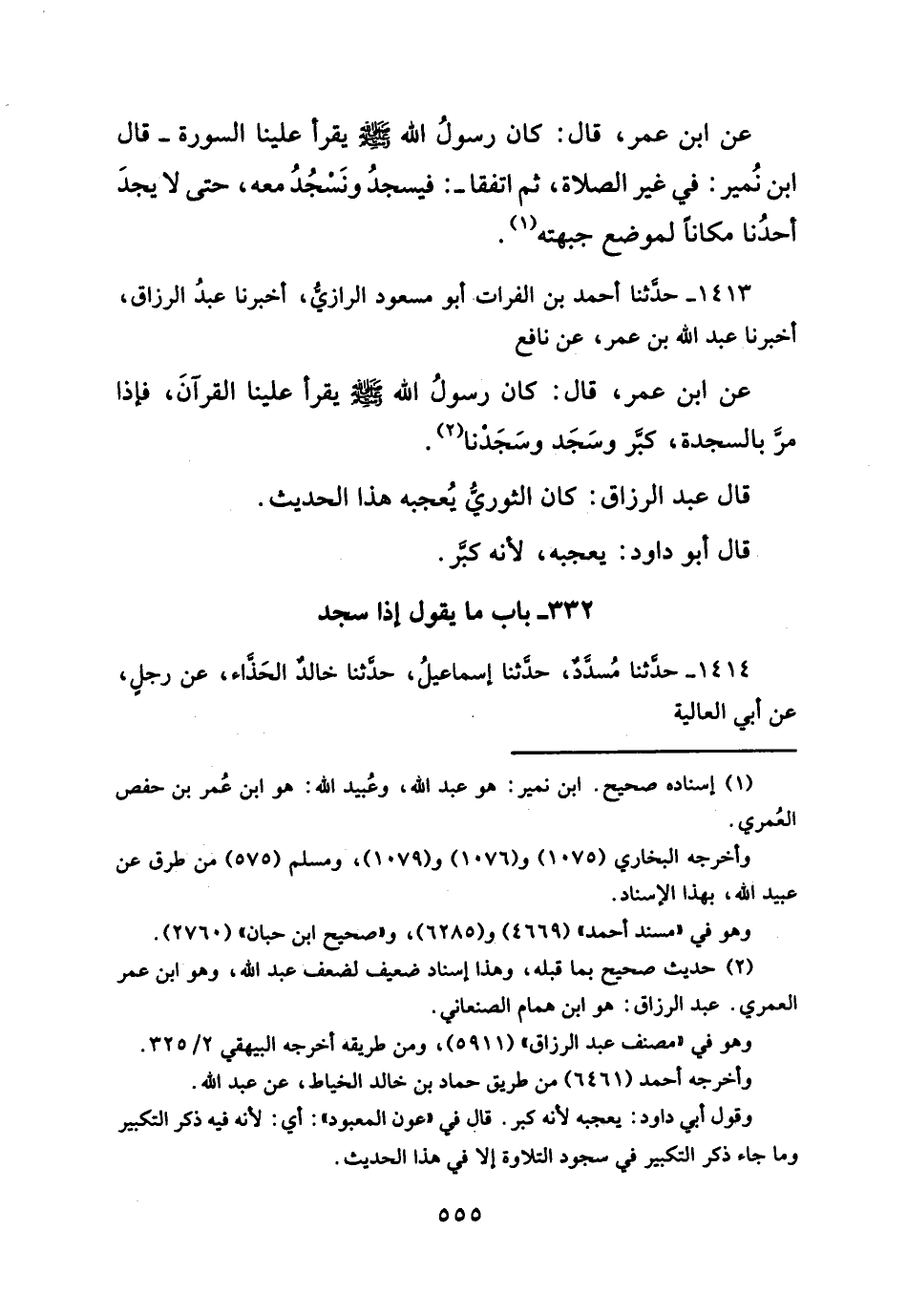 عن ابن عمر، قال: كان رسولُ الله - صلَّى الله عليه وسلم - يقرأ علينا السورة - قال ابن نُمير: في غير الصلاة، ثم اتفقا -: فيسجدُ ونَسجُدُ معه، حتى لايجدَ أحدُنا مكاناً لموضع جبهته (¬١).