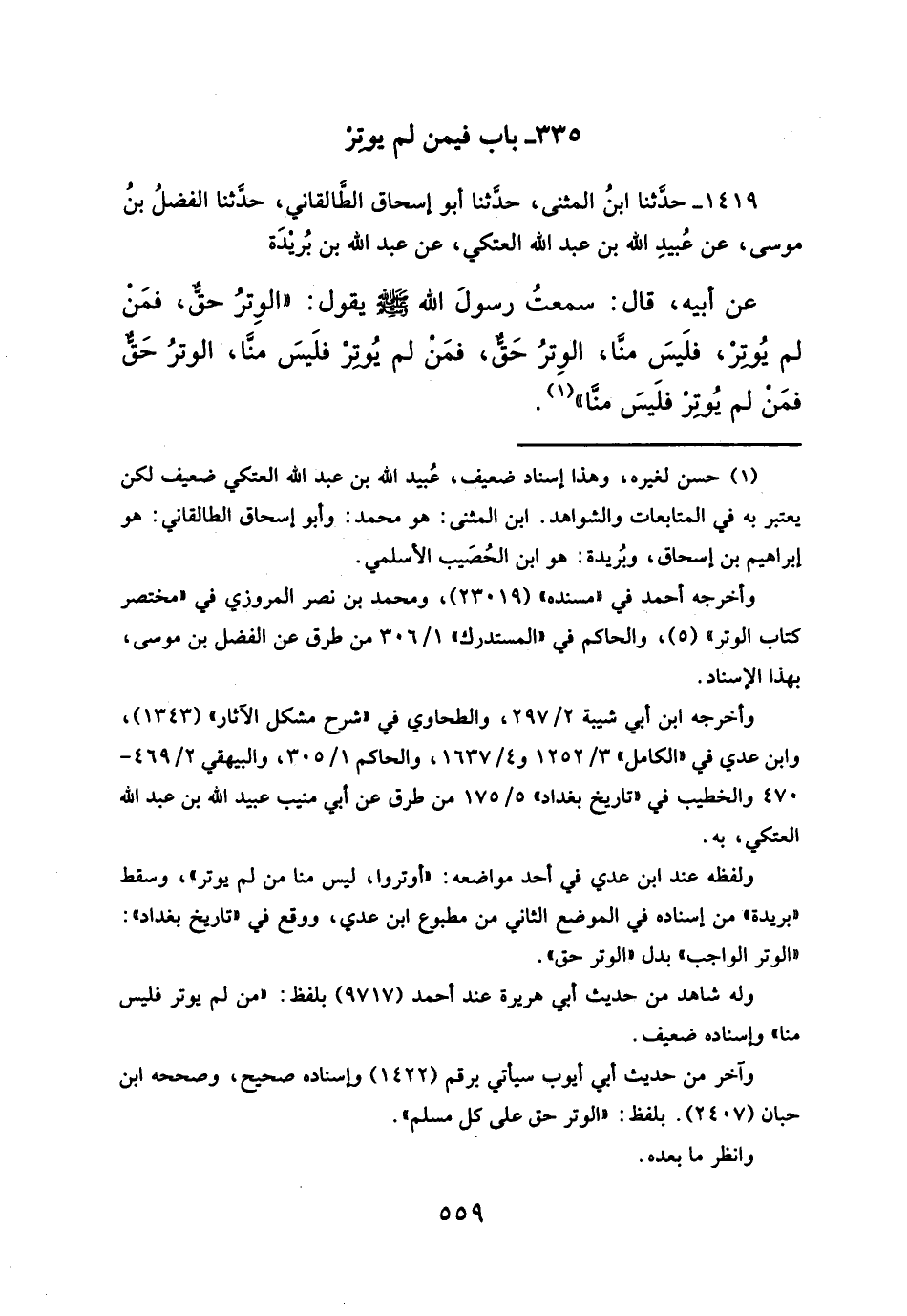 ١٤١٩ - حدَّثنا ابنُ المثنى، حدَّثنا أبو إسحاق الطَّالقاني، حدَّثنا الفضلُ بنُ موسى، عن عُبيدِ الله بن عبد الله العتكي، عن عبد الله بن بُريدة