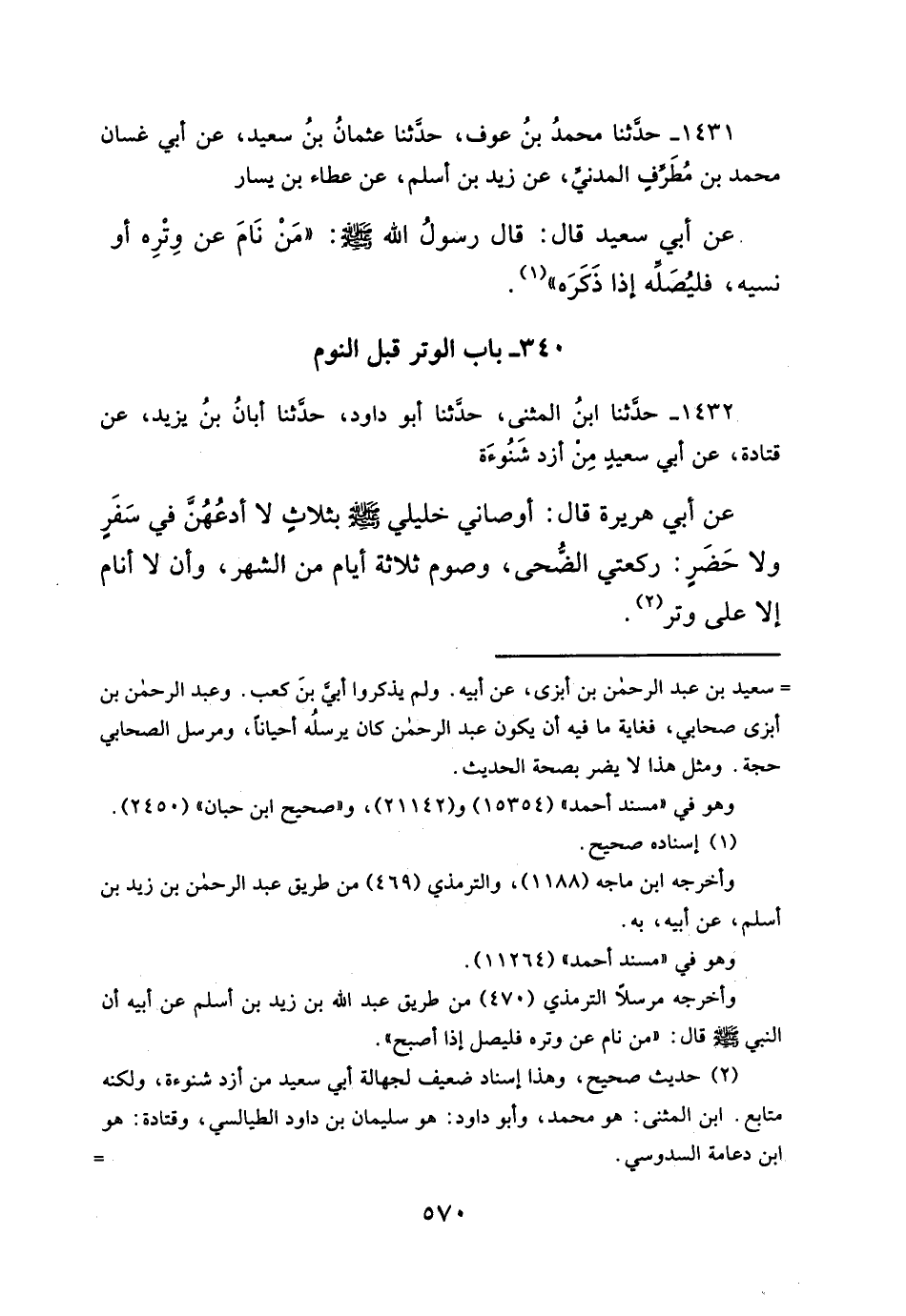 عن أبي سعيد قال: قال رسولُ الله - صلَّى الله عليه وسلم -: "مَنْ نَامَ عن وِتْرِه أو نسيه، فليُصَلِّه إذا ذَكَرَه" (¬١).