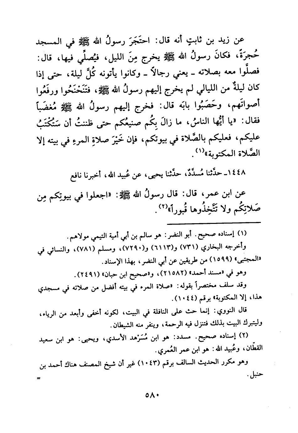عن زيد بن ثابتٍ أنه قال: احتَجَرَ رسولُ الله - صلَّى الله عليه وسلم - في المسجد حُجرَةً، فكانَ رسولُ الله - صلَّى الله عليه وسلم - يخرج مِنَ الليل، فيُصلِّي فيها، قال: فصلَّوا معه بصلاته - يعني رجالاً - وكانوا يأتونه كُل ليلة، حتى إذا كان ليلةٌ من الليالي لم يخرج إليهم رسولُ الله - صلَّى الله عليه وسلم -، فتَنَحْنَحُوا ورفَعُوا أصواتَهم، وحَصَبُوا بابَه قال: فخرج إليهم رسولُ الله - صلَّى الله عليه وسلم - مُغضَباً فقال: "يا أيها الناسُ، ما زالَ بِكُم صنيعُكم حتى ظننتُ أن سَتكْتَبُ عليكم، فعليكم بالصَّلاة في بيوتكم، فإن خَيْرَ صلاةِ المرء في بيته إلا الصَلاة المكتوبة" (¬١).