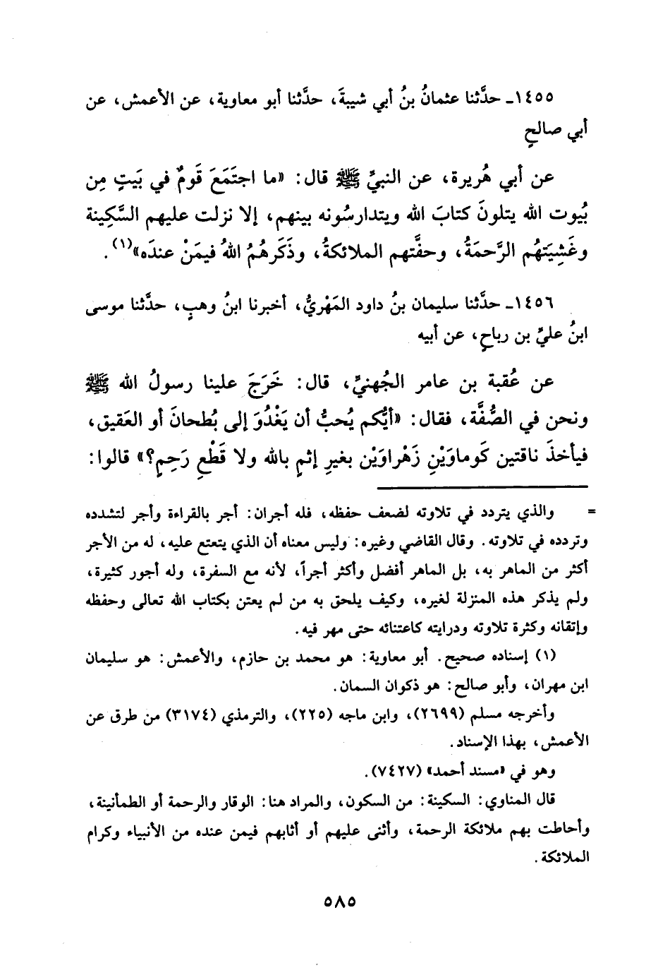عن أبي هُريرة، عن النبي - صلَّى الله عليه وسلم - قال: "ما اجتَمَعَ قَومٌ في بَيتٍ مِن بُيوت الله يتلونَ كتابَ الله ويتدارسُونه بينهم، إلا نزلت عليهم السَّكِينة وغَشِيَتهُم الرَّحمَةُ، وحفَّتهم الملائكةُ، وذَكَرهُمُ اللهُ فيمَن عندَه" (¬١).