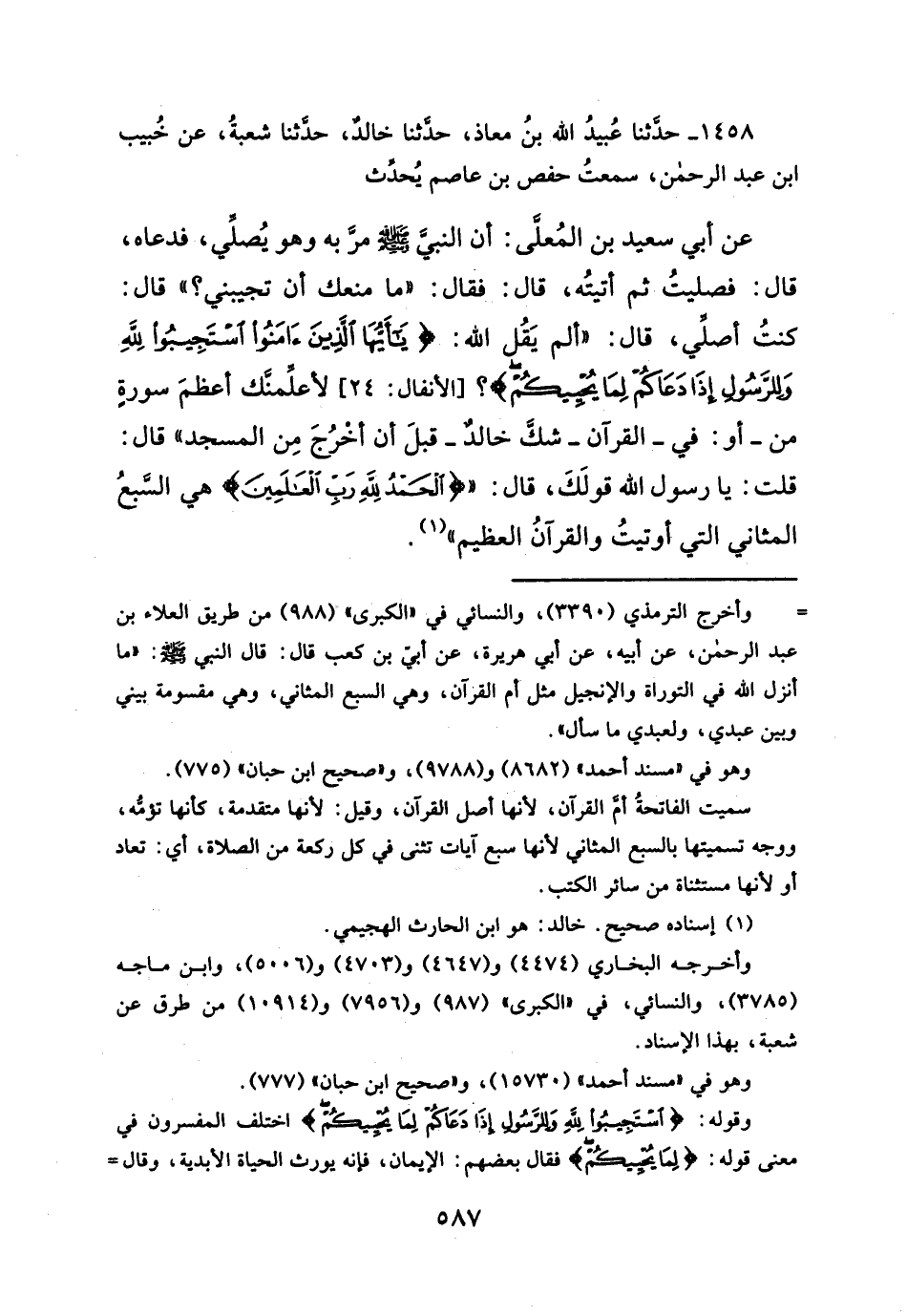 كنتُ أصلِّي، قال: "ألم يَقُل الله: {يَا أَيُّهَا الَّذِينَ آمَنُوا اسْتَجِيبُوا لِلَّهِ وَلِلرَّسُولِ إِذَا دَعَاكُمْ لِمَا يُحْيِيكُمْ}؟ [الأنفال: ٢٤]، لأعلمنَّك أعظمَ سورةِ من - أو: في - القرآن - شك خالد - قبلَ أن أخرُجَ مِن المسجد" قال: قلت: يا رسول الله قولَكَ، قال: " {الْحَمْدُ لِلَّهِ رَبِّ الْعَالَمِينَ} هي السَّبعُ المثاني التي أوتيتُ والقرآنُ العظيم" (¬١).