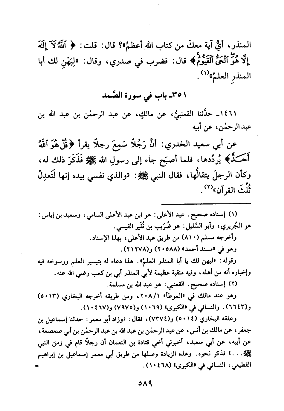 عن أبي سعيد الخدري: أنَّ رَجُلاً سَمعَ رجلاً يقرأ {قُلْ هُوَ اللَّهُ أَحَدٌ} يرددها، فلما أصبَح جاء إلى رسولِ الله - صلَّى الله عليه وسلم - فَذَكَرَ ذلك له، وكأن الرجلَ يتقالُّها، فقال النبي - صلَّى الله عليه وسلم -: "والذي نفسي بيده إنها لتعدِلُ ثُلُثَ القرآن" (¬٢).