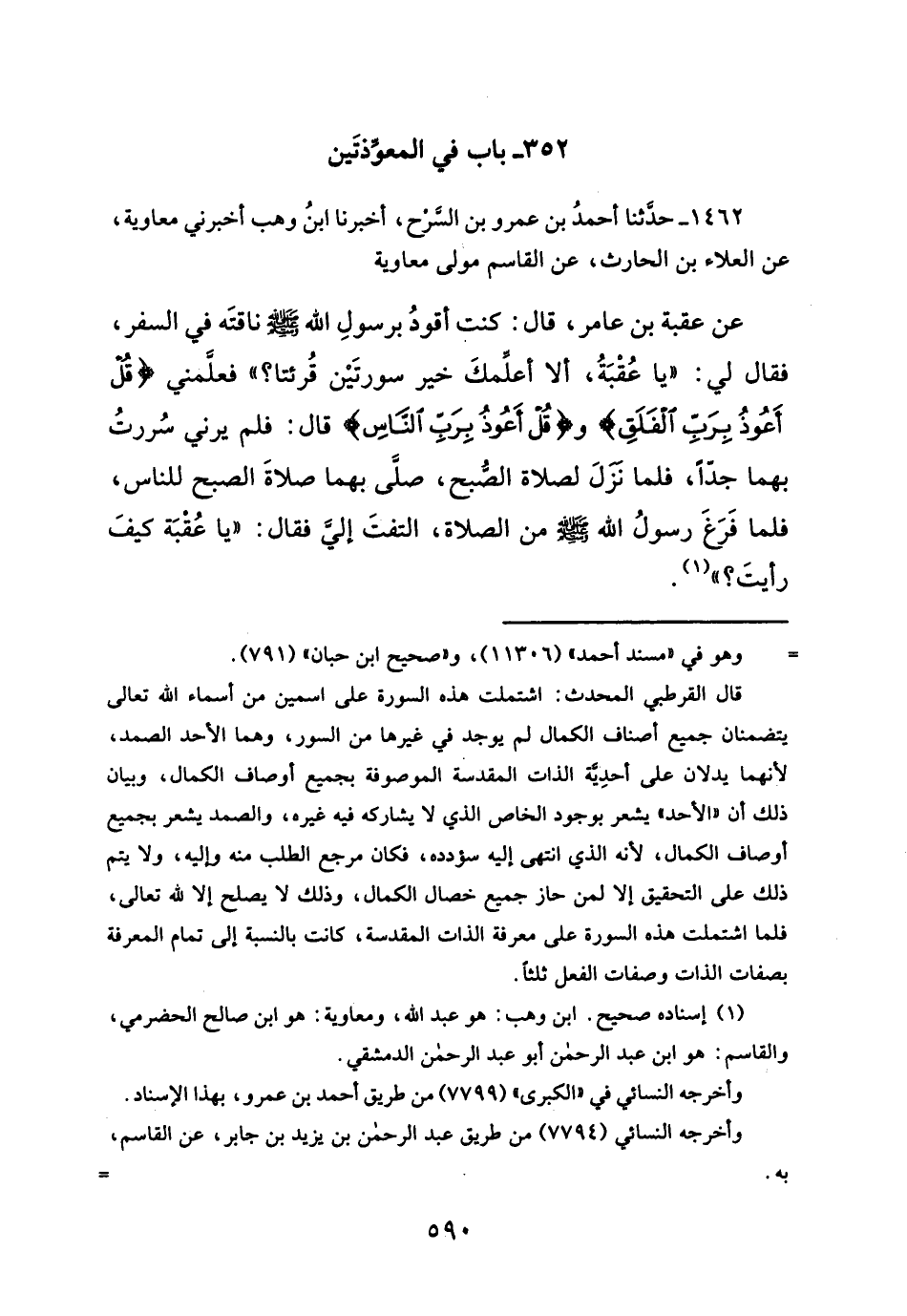 فقال لي: "يا عُقْبَةُ، ألا أعلمكَ خير سورتَيْن قُرئتا؟ " فعلَّمني {قُلْ أَعُوذُ بِرَبِّ الْفَلَقِ} و {قُلْ أَعُوذُ بِرَبِّ النَّاسِ} قال: فلم يرني سُررتُ بهما جداَ، فلما نزلَ لصلاة الصبح، صلّى بهما صلاةَ الصبح للناس،