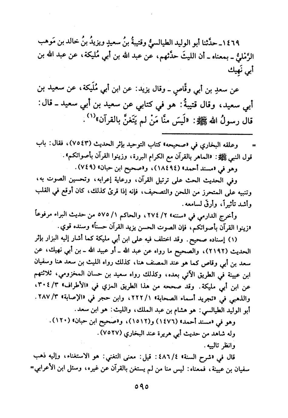 ١٤٦٩ - حدَّثنا أبو الوليد الطيالسيُّ وقتيبةُ بنُ سعيد ويزيدُ بنُ خالد بن مَوهب الرمَّليُّ - بمعناه - أن الليثَ حدّثهم، عن عبد الله بن أبي مُليكة، عن عبد الله بن أبي نَهِيك عن سعدِ بن أي وقَّاص - وقال يزيد: عن ابن أبي مُلَيكة، عن سعيد بن أبي سعيد، وقال قتيبةُ: هو في كتابي عن سعيد بن أبي سعيد - قال: قال رسولُ الله - صلَّى الله عليه وسلم -: "لَيسَ منَّا مَنْ لم يَتَغن بالقرآن" (¬١).