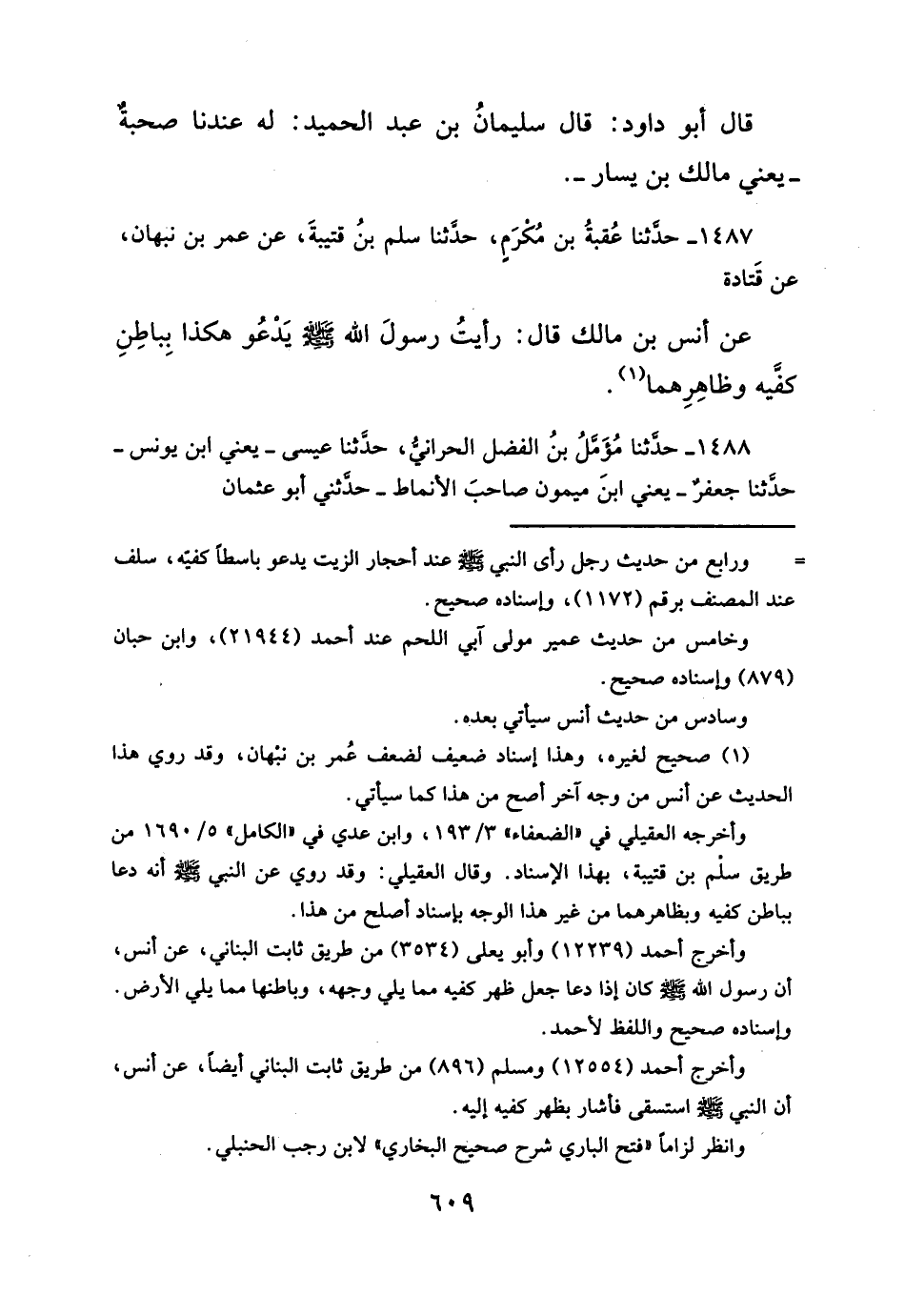عن أنس بن مالك قال: رأيتُ رسولَ الله - صلَّى الله عليه وسلم - يَدْعُو هكذا بِباطِنِ كفيه وظاهِرِهما (¬١).