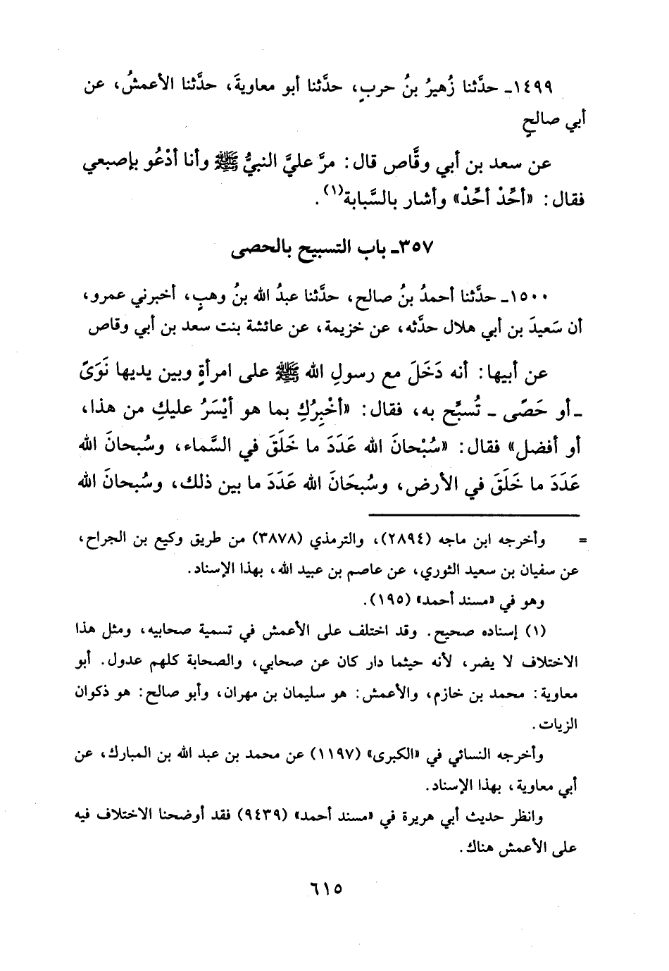 عن سعد بن أبي وقَّاص قال: مرَّ عليّ النبي - صلَّى الله عليه وسلم - وأنا أدْعُو بإصبعي فقال: "أحِّد أحِّد" وأشار بالسَّبابة (¬١).