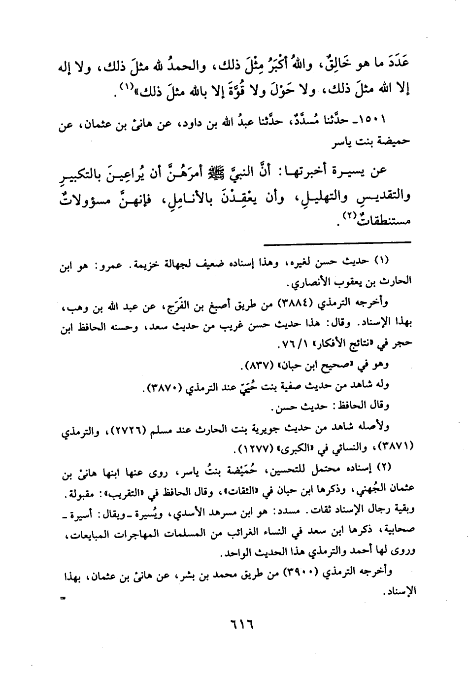 ١٥٠١ - حدَّثنا مسدَّدٌ، حدَّثنا عبدُ الله بن داود، عن هانئ بن عثمان، عن حميضة بنت ياسر