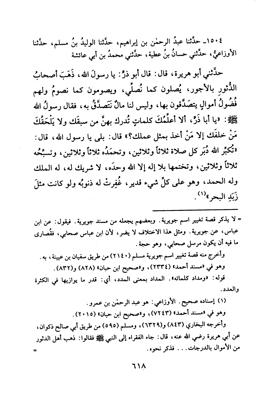 حدثني أبو هريرة، قال: قال أبو ذرٍّ: يا رسولَ الله، ذَهَبَ أصحابُ الدُثورِ بالأجور، يُصلون كما نُصلِّي، ويصومون كما نصومُ ولهم فُضُولُ أموالٍ يتصَدَّقون بها، وليس لنا مالٌ نَتَصدَقُ به، فقال رسولُ الله - صلَّى الله عليه وسلم -: "يا أبا ذرٍّ، ألا أعلمُكَ كلمات تُدرك بهن من سبقَك ولا يَلْحَقُكَ مَنْ خلفَك إلا مَنْ أخذ بمثل عملك؟ " قال: بلى يا رسول الله، قال: "تكبر الله دُبَر كل صلاة ثلاثاً وثلاثين، وتحمَدُه ثلاثاً وثلاثين، وتسبّحُه ثلائاً وثلاثين، وتختمها بلا إله إلا الله وحدَه، لا شريك له، له الملك وله الحمد، وهو على كل شيء قدير، غُفِرتْ له ذنوبُه ولو كانت مثلَ زَبَدِ البحر" (¬١).