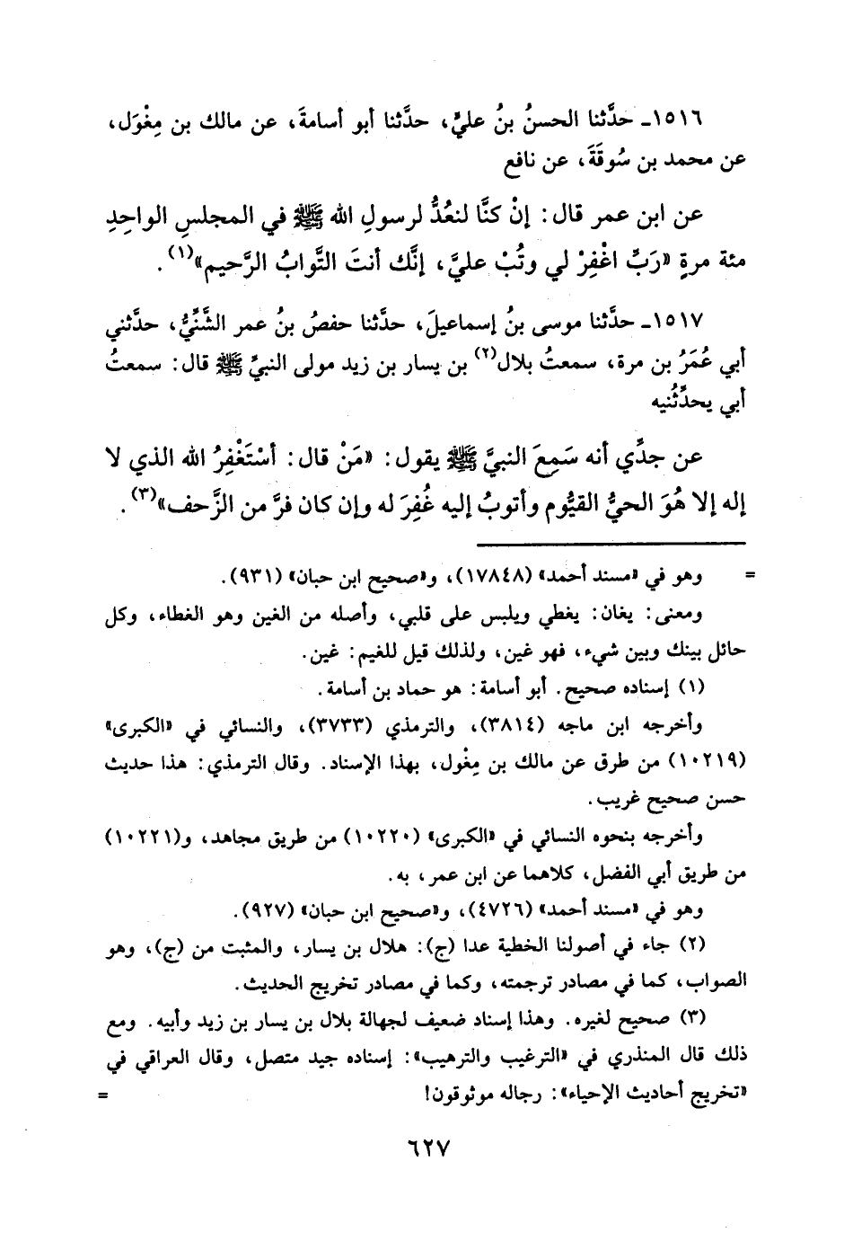 ١٥١٧ - حدَّثنا موسى بنُ إسماعيلَ، حدَّثنا حفصُ بنُ عمر الشَّنِّيُّ، حدثني أبي عُمَرُ بن مرة، سمعتُ بلال (¬٢) بن يسار بن زيد مولى النبيِّ - صلَّى الله عليه وسلم - قال: سمعتُ أبي يحدثُنيه عن جدِّي أنه سَمعَ النبيَّ - صلَّى الله عليه وسلم - يقول: "مَنْ قال: أسْتَغْفِرُ الله الذي لا إله إلا هُوَ الحي القيوم وأتوب إليه غُفِرَ له وإن كان فرَّ من الزَّحف" (¬٣).