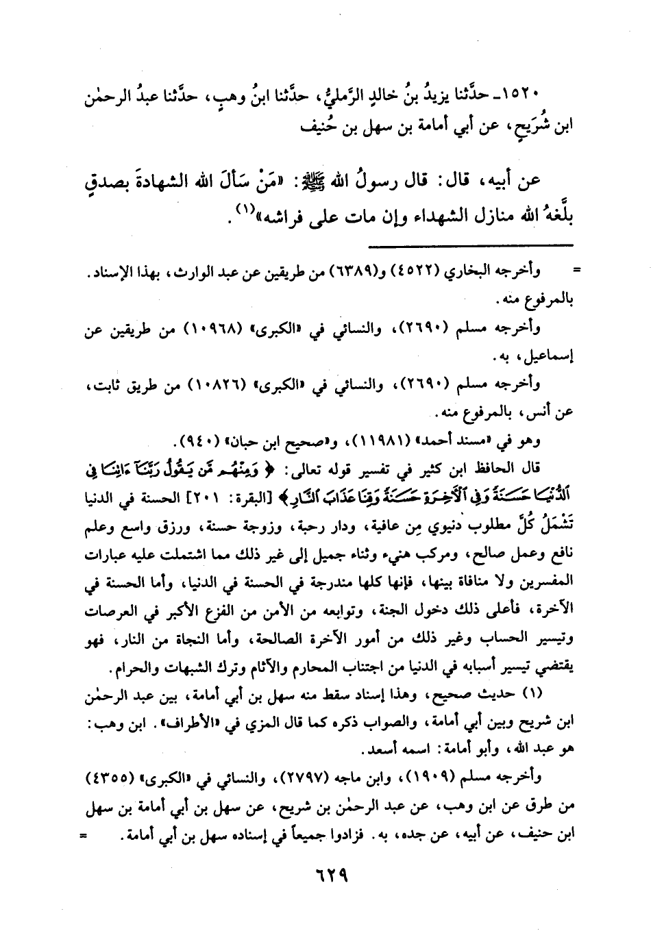 ١٥٢٠ - حدَّثنا يزيدُ بنُ خالدٍ الرَّملي، حدَّثنا ابنُ وهبٍ، حدَّثنا عبدُ الرحمن ابن شُرَيحٍ، عن أبي أمامة بن سهل بن حُنيف