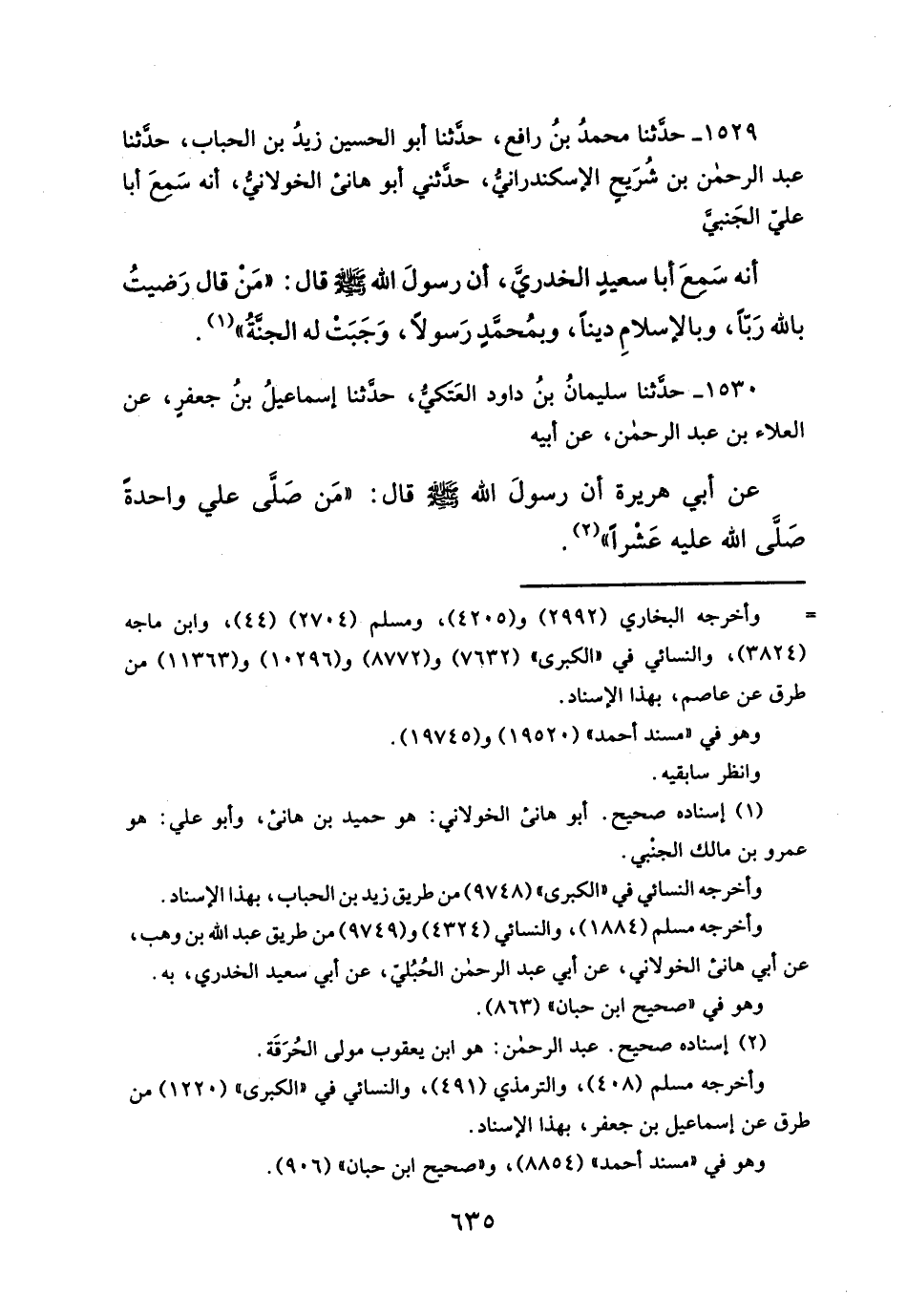 ١٥٢٩ - حدَّثنا محمدُ بنُ رافع، حدَّثنا أبو الحسين زيدُ بن الحباب، حدَّثنا عبد الرحمن بن شُرَيحٍ الإسكندرانيُّ، حدثني أبو هانئ الخولانيُّ، أنه سَمعَ أبا عليّ الجَنبيَّ