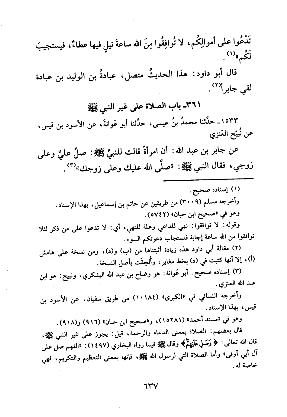 عن جابر بن عبد الله: أن امرأةَ قالت للنبى - صلَّى الله عليه وسلم -: صلِّ عليَّ وعلى زوجي، فقال النبي - صلَّى الله عليه وسلم -: "صلَّى الله عليك وعلى زوجك" (¬٣).