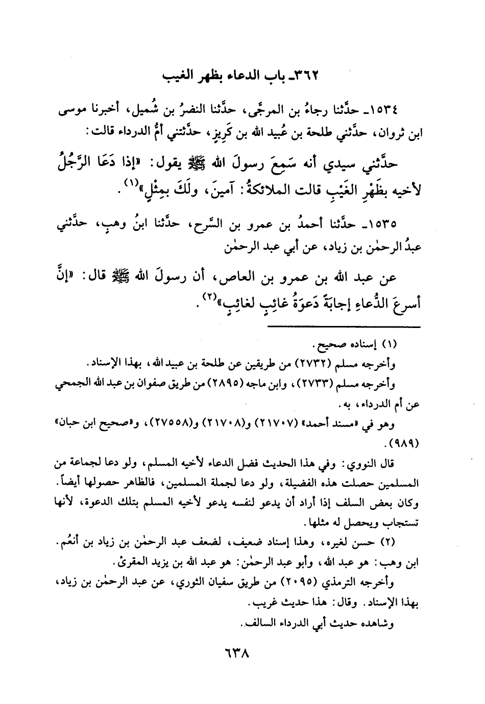 ١٥٣٤ - حدَّثنا رجاءُ بن المرجى، حدَّثنا النضرُ بن شُميل، أخبرنا موسى ابن ثروان، حدَثني طلحة بن عُبيد الله بن كَرِيزٍ، حدثتني أمُّ الدرداء قالت:
