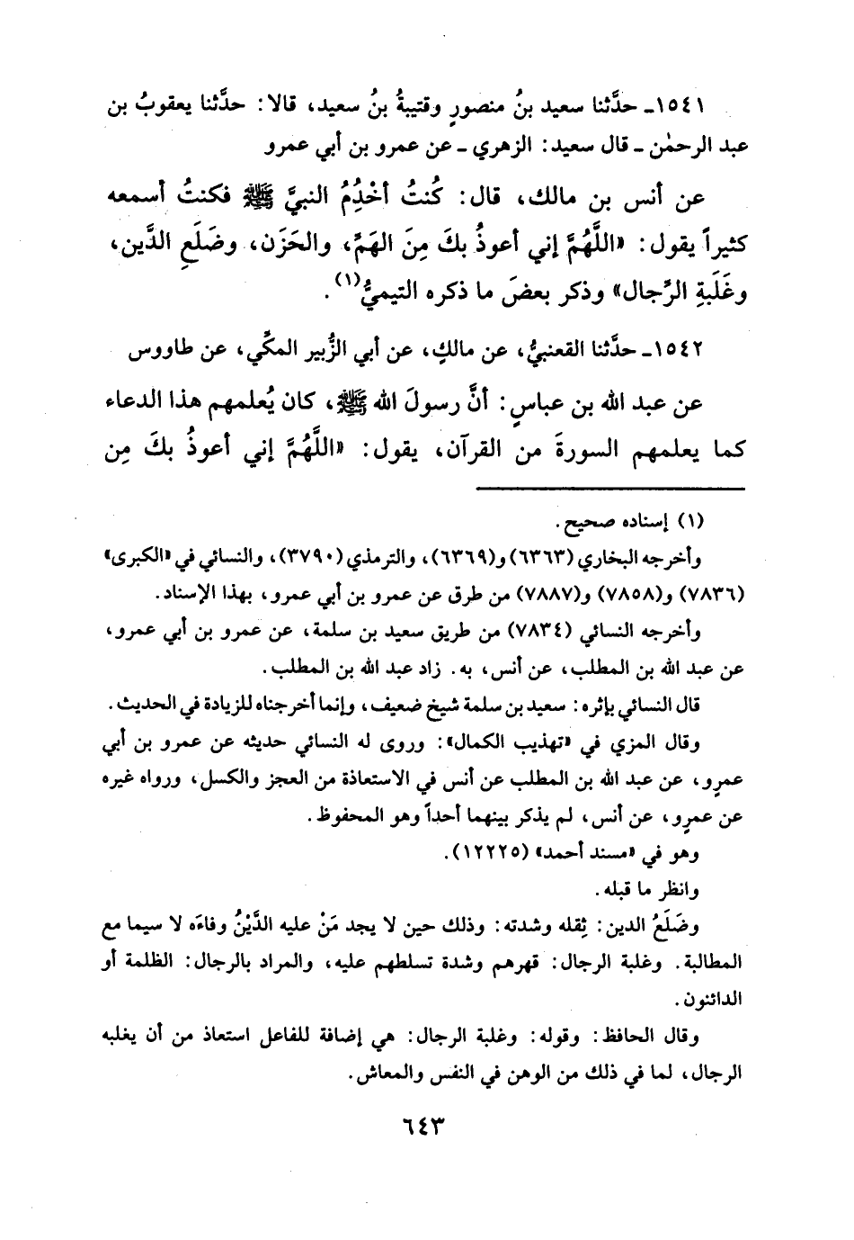 عن أنس بن مالك، قال: كُنتُ أخْدُمُ النبي - صلَّى الله عليه وسلم - فكنتُ أسمعه كثيراً يقول: "اللهمَّ إنى أعوذُ بكَ مِنَ الهَم، والحَزَن، وضَلَعِ الدَّين، وغَلَبةِ الرِّجال" وذكر بعضَ ما ذكره التيميُّ (¬١).