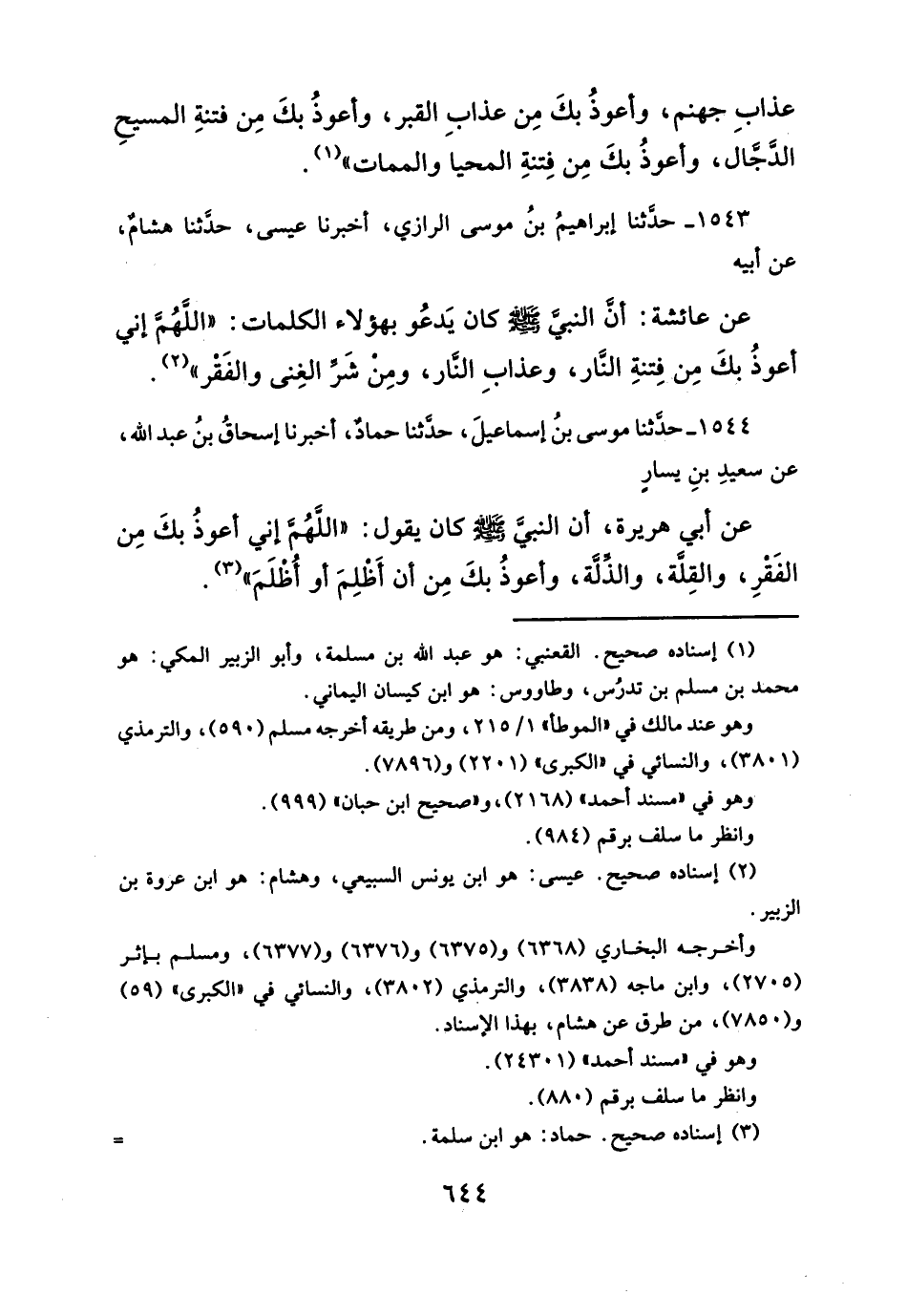 عذابِ جهنم، وأعوذُ بكَ مِن عذابِ القبر، وأعوذُ بكَ مِن فتنةِ المسيحِ الدجال، وأعوذُ بكَ مِن فِتنةِ المحيا والممات" (¬١).