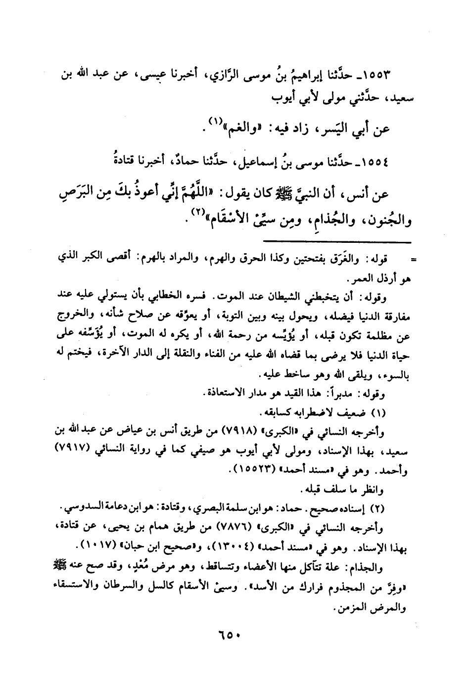 عن أنس، أن النبي - صلَّى الله عليه وسلم - كان يقول: "اللهم إني أعوذُ بكَ مِن البَرَصِ والجُنون، والجُذامِ، ومِن سيئ الأسقَام" (¬٢).