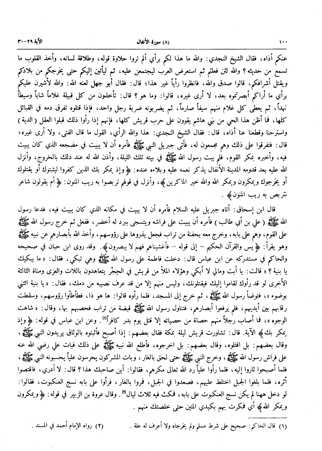 عنكم أذاه؛ فَقَالَ الشَّيْخُ النَّجْدِيُّ: وَاللَّهِ مَا هَذَا لَكُمْ برأي ألم تروا حلاوة قوله، وطلاقة لِسَانِهِ، وَأَخْذَ الْقُلُوبِ مَا تَسْمَعُ مِنْ حَدِيثِهِ؟ وَاللَّهِ لَئِنْ فَعَلْتُمْ ثُمَّ اسْتَعْرَضَ الْعَرَبَ لَيَجْتَمِعَنَّ عليه، ثُمَّ لَيَأْتِيَنَّ إِلَيْكُمْ حَتَّى يُخْرِجَكُمْ مِنْ بِلَادِكُمْ ويقتل أشرافكم، قالوا صدق والله، فانظروا رأياً غير هذا، فَقَالَ أَبُو جَهْلٍ لَعَنَهُ اللَّهُ: وَاللَّهِ لَأُشِيرَنَّ عليكم برأي ما أراكم أبصرتموه بعد، لا أرى غيره، قالوا: وما هو؟ قال: تأخذون مِنْ كُلِّ قَبِيلَةٍ غُلَامًا شَابًّا وَسِيطًا نَهِدًا، ثُمَّ يُعْطَى كُلُّ غُلَامٍ مِنْهُمْ سَيْفًا صَارِمًا، ثُمَّ يَضْرِبُونَهُ ضَرْبَةَ رَجُلٍ وَاحِدٍ، فَإِذَا قَتَلُوهُ تفرق دمه في القبائل كلها، فما أَظُنُّ هَذَا الْحَيَّ مِنْ بَنِي هَاشِمٍ يَقْوَوْنَ عَلَى حَرْبِ قُرَيْشٍ كُلِّهَا، فَإِنَّهُمْ إِذَا رَأَوْا ذلك قبلوا العقل (الدية) وَاسْتَرَحْنَا وَقَطَعْنَا عَنَّا أَذَاهُ، قَالَ: فَقَالَ الشَّيْخُ النَّجْدِيُّ: هَذَا وَاللَّهِ الرَّأْيُ، الْقَوْلُ مَا قَالَ الفتى، ولا أرى غَيْرَهُ؛ قَالَ: فَتَفَرَّقُوا عَلَى ذَلِكَ وَهُمْ مُجْمِعُونَ لَهُ، فَأَتَى جِبْرِيلُ النَّبِيَّ صَلَّى اللَّهُ عَلَيْهِ وَسَلَّمَ فأمره أن لا يَبِيتَ فِي مَضْجَعِهِ الَّذِي كَانَ يَبِيتُ فِيهِ، وَأَخْبَرَهُ بِمَكْرِ الْقَوْمِ، فَلَمْ يَبِتْ رَسُولُ اللَّهِ صَلَّى اللَّهُ عَلَيْهِ وَسَلَّمَ فِي بَيْتِهِ تِلْكَ اللَّيْلَةَ، وَأَذِنَ اللَّهُ لَهُ عِنْدَ ذَلِكَ بِالْخُرُوجِ، وَأَنْزَلَ اللَّهُ عَلَيْهِ بَعْدَ قُدُومِهِ الْمَدِينَةَ الْأَنْفَالَ يَذْكُرُ نِعَمَهُ عَلَيْهِ وَبَلَاءَهُ عِنْدَهُ: {وَإِذْ يَمْكُرُ بِكَ الَّذِينَ كَفَرُواْ لِيُثْبِتُوكَ أَوْ يَقْتُلُوكَ أَوْ يُخْرِجُوكَ وَيَمْكُرُونَ وَيَمْكُرُ اللَّهُ وَاللَّهُ خَيْرُ الْمَاكِرِينَ}، وأنزل في قولهم تربصوا به ريب المنون: {أَمْ يَقُولُونَ شَاعِرٌ نَّتَرَبَّصُ بِهِ رَيْبَ الْمَنُونِ}.