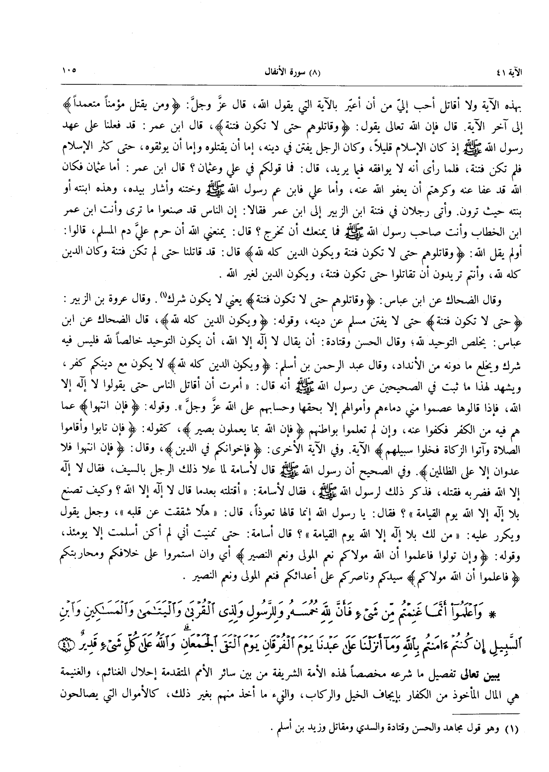 - 41 - وَاعْلَمُوا أَنَّمَا غَنِمْتُمْ مِّن شَيْءٍ فَأَنَّ للَّهِ خُمُسَهُ وَلِلرَّسُولِ وَلِذِي الْقُرْبَى وَالْيَتَامَى وَالْمَسَاكِينِ وَابْنِ السَّبِيلِ إِن كُنتُمْ آمَنتُمْ بِاللَّهِ وَمَآ أَنزَلْنَا عَلَى عَبْدِنَا يَوْمَ الْفُرْقَانِ يَوْمَ الْتَقَى الْجَمْعَانِ وَاللَّهُ عَلَى كُلِّ شَيْءٍ قَدِيرٌ