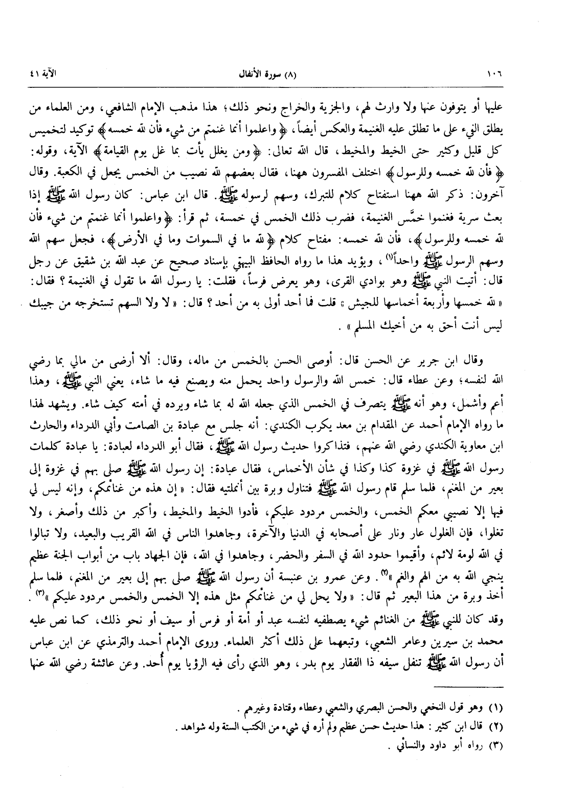 عَلَيْهَا أَوْ يُتَوَفَّوْنَ عَنْهَا وَلَا وَارِثَ لَهُمْ، وَالْجِزْيَةُ وَالْخَرَاجُ وَنَحْوُ ذَلِكَ؛ هَذَا مَذْهَبُ الْإِمَامِ الشافعي، وَمِنَ الْعُلَمَاءِ مَنْ يُطْلِقُ الْفَيْءَ عَلَى مَا تطلق عليه الغنيمة والعكس أيضاً، {وَاعْلَمُوا أَنَّمَا غَنِمْتُمْ مِّن شَيْءٍ فَإِنَّ لِلَّهِ خُمُسَهُ} تَوْكِيدٌ لِتَخْمِيسِ كُلِّ قَلِيلٍ وَكَثِيرٍ حَتَّى الْخَيْطِ وَالْمَخِيطِ، قَالَ اللَّهُ تَعَالَى: {وَمَنْ يَغْلُلْ يَأْتِ بِمَا غَلَّ يَوْمَ القيامة} الآية، وَقَوْلُهُ: {فَإِن للَّهِ خُمُسَهُ وَلِلرَّسُولِ} اخْتَلَفَ الْمُفَسِّرُونَ ههنا، فَقَالَ بَعْضُهُمْ لِلَّهِ نَصِيبٌ مِنَ الْخُمُسِ يُجْعَلُ في الكعبة. وقال آخرون: ذكر الله ههنا استفتاح كلام للتبرك، وسهم لرسوله صلى الله عليه وسلم. قال ابْنِ عَبَّاسٍ: كَانَ رَسُولُ اللَّهِ صَلَّى اللَّهُ عَلَيْهِ وَسَلَّمَ إِذَا بَعَثَ سَرِيَّةً فَغَنِمُوا خمَّس الْغَنِيمَةَ، فَضَرَبَ ذَلِكَ الْخُمُسَ فِي خَمْسَةٍ، ثُمَّ قَرَأَ: {وَاعْلَمُوا أَنَّمَا غَنِمْتُمْ مِّن شَيْءٍ فَإِنَّ للَّهِ خُمُسَهُ وَلِلرَّسُولِ}، فَأَنَّ للَّهِ خُمُسَهُ: مفتاح الكلام {لِلَّهِ مَا فِي السموات وَمَا فِي الْأَرْضِ}، فَجَعَلَ سَهْمَ اللَّهِ وَسَهْمَ الرسول صلى الله عليه وسلم واحداً (وهو قول النخعي والحسن البصري والشعبي وعطاء وقتادة وغيرهم)، ويؤيد هذا ما رواه الحافظ الْبَيْهَقِيُّ بِإِسْنَادٍ صَحِيحٍ عَنْ عَبْدِ اللَّهِ بْنِ شقيق عن رجل قَالَ: أَتَيْتُ النَّبِيَّ صَلَّى اللَّهُ عَلَيْهِ وَسَلَّمَ وَهُوَ بِوَادِي الْقُرَى، وَهُوَ يَعْرِضُ فَرَسًا، فَقُلْتُ: يَا رَسُولَ اللَّهِ مَا تَقُولُ فِي الْغَنِيمَةِ؟ فقال: «لله خمسها وأربعة أخماسها لِلْجَيْشِ» قُلْتُ فَمَا أَحَدٌ أَوْلَى بِهِ مِنْ أَحَدٍ؟ قَالَ: «لَا وَلَا السَّهْمُ تَسْتَخْرِجُهُ مِنْ جيبك لَيْسَ أَنْتَ أَحَقَّ بِهِ مِنْ أَخِيكَ الْمُسْلِمِ».