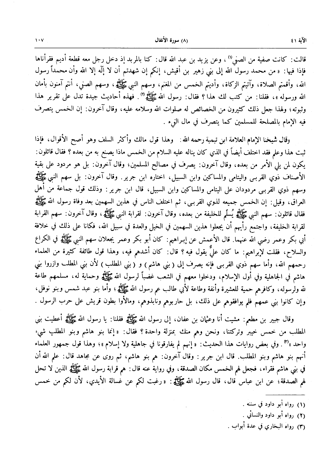 وَقَالَ شَيْخُنَا الْإِمَامُ الْعَلَّامَةُ ابْنُ تَيْمِيَّةَ رَحِمَهُ اللَّهُ: وَهَذَا قَوْلُ مَالِكٍ وَأَكْثَرُ السَّلَفِ وَهُوَ أَصَحُّ الْأَقْوَالِ، فَإِذَا ثَبَتَ هَذَا وَعُلِمَ فَقَدِ اخْتُلِفَ أيضاً في الذي كان يناله مِنَ الْخُمُسِ مَاذَا يُصْنَعُ بِهِ مَنْ بَعْدَهُ؟ فَقَالَ قَائِلُونَ: يَكُونُ لِمَنْ يَلِي الْأَمْرَ مِنْ بعده، وَقَالَ آخَرُونَ: يُصْرَفُ فِي مَصَالِحِ الْمُسْلِمِينَ؛ وَقَالَ آخَرُونَ: بَلْ هُوَ مَرْدُودٌ عَلَى بَقِيَّةِ الْأَصْنَافِ ذَوِي الْقُرْبَى وَالْيَتَامَى وَالْمَسَاكِينِ وَابْنِ السَّبِيلِ، اخْتَارَهُ ابْنُ جَرِيرٍ. وَقَالَ آخَرُونَ: بَلْ سَهْمُ النَّبِيِّ صَلَّى اللَّهُ عَلَيْهِ وَسَلَّمَ وَسَهْمُ ذَوِي الْقُرْبَى مَرْدُودَانِ عَلَى الْيَتَامَى وَالْمَسَاكِينِ وَابْنِ السَّبِيلِ، قَالَ ابْنُ جَرِيرٍ: وَذَلِكَ قَوْلُ جَمَاعَةٍ مِنْ أَهْلِ الْعِرَاقِ، وَقِيلَ: إِنَّ الْخُمُسَ جَمِيعُهُ لِذَوِي الْقُرْبَى، ثُمَّ اخْتَلَفَ النَّاسُ فِي هَذَيْنَ السَّهْمَيْنِ بَعْدَ وَفَاةِ رَسُولِ اللَّهِ صَلَّى اللَّهُ عَلَيْهِ وَسَلَّمَ فَقَالَ قَائِلُونَ: سَهْمُ النَّبِيِّ صَلَّى اللَّهُ عَلَيْهِ وسلم يُسلّم للخليفة من بعده، وقال آخرون: لِقَرَابَةِ النَّبِيِّ صَلَّى اللَّهُ عَلَيْهِ وَسَلَّمَ، وَقَالَ آخرون: سهم القرابة لقرابة الخليفة، واجتمع رأيهم أَنْ يَجْعَلُوا هَذَيْنِ السَّهْمَيْنِ فِي الْخَيْلِ وَالْعُدَّةِ فِي سَبِيلِ اللَّهِ، فَكَانَا عَلَى ذَلِكَ فِي خِلَافَةِ أَبِي بَكْرٍ وَعُمَرَ رَضِيَ اللَّهُ عَنْهُمَا. قَالَ الْأَعْمَشُ عَنْ إِبْرَاهِيمَ: كَانَ أَبُو بَكْرٍ وَعُمَرَ يَجْعَلَانِ سَهْمَ النَّبِيِّ صَلَّى اللَّهُ عَلَيْهِ وَسَلَّمَ فِي الكُرَاع وَالسِّلَاحِ، فَقُلْتُ لِإِبْرَاهِيمَ: مَّا كَانَ عليَّ يقول فيه؟ قال: كان أَشَدَّهُمْ فِيهِ، وَهَذَا قَوْلُ طَائِفَةٍ كَثِيرَةٍ مِنَ الْعُلَمَاءِ رَحِمَهُمُ اللَّهُ، وَأَمَّا سَهْمُ ذَوِي الْقُرْبَى فإنه يصرف إلى (بني هاشم) و (بني الْمُطَّلِبِ) لِأَنَّ بَنِي الْمُطَّلِبِ وَازَرُوا بَنِي هَاشِمٍ فِي الْجَاهِلِيَّةِ وَفِي أَوَّلِ الْإِسْلَامِ، وَدَخَلُوا مَعَهُمْ فِي الشِّعْبِ غَضَبًا لِرَسُولِ اللَّهِ صَلَّى اللَّهُ عَلَيْهِ وَسَلَّمَ وَحِمَايَةً لَهُ،