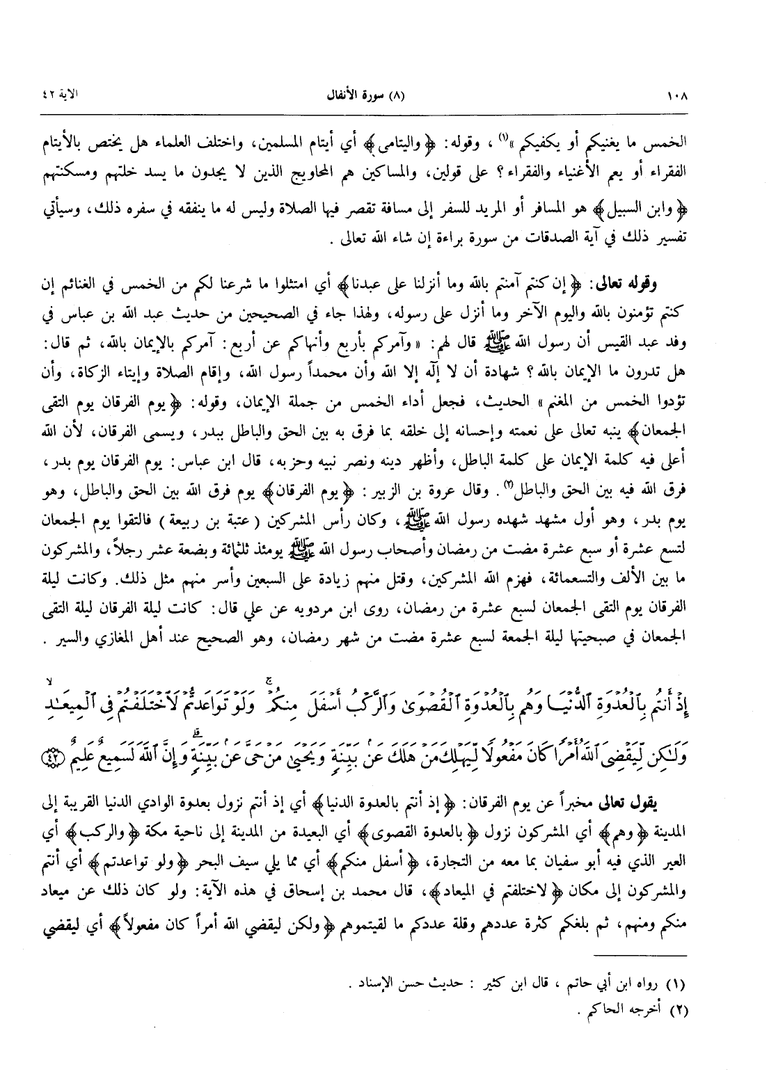 وقوله تعالى: {إِن كُنتُمْ آمَنْتُمْ بِاللَّهِ وَمَآ أَنزَلْنَا عَلَى عَبْدِنَا} أَي امْتَثِلُوا مَا شَرَعْنَا لَكُمْ مِنَ الْخُمُسِ فِي الْغَنَائِمِ إِنْ كُنْتُمْ تُؤْمِنُونَ بِاللَّهِ وَالْيَوْمِ الْآخِرِ وَمَا أَنْزَلَ عَلَى رَسُولِهِ، وَلِهَذَا جَاءَ فِي الصَّحِيحَيْنِ مِنْ حَدِيثِ عَبْدِ اللَّهِ بْنِ عباس في وَفْدِ عَبْدِ الْقَيْسِ أَنَّ رَسُولَ اللَّهِ صَلَّى اللَّهُ عَلَيْهِ وَسَلَّمَ قَالَ لَهُمْ: "وَآمُرُكُمْ بِأَرْبَعٍ وَأَنْهَاكُمْ عَنْ أَرْبَعٍ: آمُرُكُمْ بِالْإِيمَانِ بِاللَّهِ، ثُمَّ قَالَ: هَلْ تَدْرُونَ مَا الْإِيمَانُ بِاللَّهِ؟ شَهَادَةُ أَنْ لَا إِلَهَ إِلَّا اللَّهُ وَأَنَّ مُحَمَّدًا رَسُولُ اللَّهِ، وَإِقَامُ الصَّلَاةِ وَإِيتَاءُ الزَّكَاةِ، وَأَنْ تؤدوا الخمس من المغنم" الحديث، فجعل أداء الخمس من جملة الإيمان، وقوله: {يَوْمَ الفرقان يوم التقى الجمعان} يُنَبِّهُ تَعَالَى عَلَى نِعْمَتِهِ وَإِحْسَانِهِ إِلَى خَلْقِهِ بِمَا فَرَقَ بِهِ بَيْنَ الْحَقِّ وَالْبَاطِلِ بِبَدْرٍ، ويسمى الفرقان، لأن الله أَعْلَى فِيهِ كَلِمَةَ الْإِيمَانِ عَلَى كَلِمَةِ الْبَاطِلِ، وأظهر دينه ونصر نبيه وحزبه، قال ابْنِ عَبَّاسٍ: يَوْمَ الْفُرْقَانِ يَوْمُ بَدْرٍ، فَرَقَ الله فيه بين الحق والباطل (أخرجه الحاكم). وقال عروة بن الزبير: {يَوْمَ الفرقان} يوم فرق الله بَيْنَ الْحَقِّ وَالْبَاطِلِ، وَهُوَ يَوْمُ بَدْرٍ، وَهُوَ أَوَّلُ مَشْهَدٍ شَهِدَهُ رَسُولُ اللَّهِ صَلَّى اللَّهُ عَلَيْهِ وَسَلَّمَ، وَكَانَ رَأْسُ الْمُشْرِكِينَ (عُتْبَةُ بْنُ ربيعة) فالتقوا يوم الجمعان لِتِسْعَ عَشْرَةَ أَوْ سَبْعَ عَشْرَةَ مَضَتْ مِنْ رَمَضَانَ وَأَصْحَابُ رَسُولِ اللَّهِ صَلَّى اللَّهُ عَلَيْهِ وَسَلَّمَ يَوْمَئِذٍ ثَلَثُمِائَةٍ وَبِضْعَةَ عَشَرَ رَجُلًا، وَالْمُشْرِكُونَ مَا بَيْنَ الْأَلِفِ وَالتِّسْعِمِائَةِ، فَهَزَمَ اللَّهُ الْمُشْرِكِينَ،