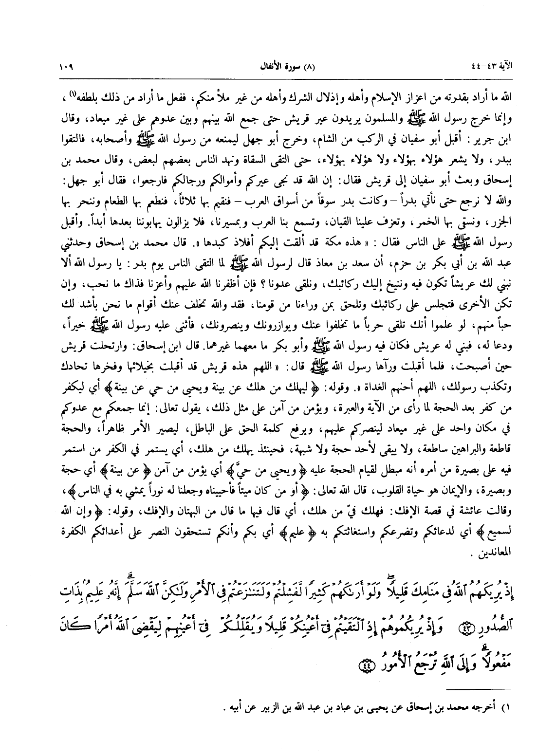 اللَّهُ مَا أَرَادَ بِقُدْرَتِهِ مِنْ إِعْزَازِ الْإِسْلَامِ وأهله وإذلال الشرك وأهله من غَيْرِ مَلَأٍ مِنْكُمْ، فَفَعَلَ مَا أَرَادَ مِنْ ذلك بلطفه (أخرجه مُحَمَّدُ بْنُ إِسْحَاقَ عَنْ يَحْيَى بْنِ عَبَّادِ بْنِ عَبْدِ اللَّهِ بْنِ الزُّبَيْرِ عَنْ أَبِيهِ)، وَإِنَّمَا خَرَجَ رَسُولُ اللَّهِ صَلَّى اللَّهُ عَلَيْهِ وَسَلَّمَ وَالْمُسْلِمُونَ يُرِيدُونَ عِيرَ قُرَيْشٍ حَتَّى جَمَعَ اللَّهُ بَيْنَهُمْ وَبَيْنَ عَدُوِّهِمْ عَلَى غَيْرِ مِيعَادٍ، وقال ابن جرير: أقبل أبو سفيام فِي الرَّكْبِ مِنَ الشَّامِ، وَخَرَجَ أَبُو جَهْلٍ لِيَمْنَعَهُ مِنْ رَسُولِ اللَّهِ صَلَّى اللَّهُ عَلَيْهِ وَسَلَّمَ وأصحابه، فالتقوا ببدر، ولا يَشْعُرُ هَؤُلَاءِ بِهَؤُلَاءِ وَلَا هَؤُلَاءِ بِهَؤُلَاءِ، حَتَّى التقى السُّقَاةُ وَنَهَدَ النَّاسُ بَعْضُهُمْ لِبَعْضٍ، وَقَالَ مُحَمَّدُ بن إسحاق وبعث أبو سفيان إِلَى قُرَيْشٍ فَقَالَ: إِنَّ اللَّهَ قَدْ نَجَّى عِيرَكُمْ وَأَمْوَالَكُمْ وَرِجَالَكُمْ فَارْجِعُوا، فَقَالَ أَبُو جَهْلٍ: وَاللَّهِ لَا نَرْجِعُ حَتَّى نَأْتِيَ بَدْرًا - وَكَانَتْ بَدْرٌ سُوقًا مِنْ أَسْوَاقِ الْعَرَبِ - فَنُقِيمَ بِهَا ثَلَاثًا، فَنُطْعِمَ بِهَا الطَّعَامَ وَنَنْحَرَ بِهَا الْجُزُرَ، ونَسْقِيَ بِهَا الْخَمْرَ، وَتَعْزِفَ عَلَيْنَا الْقِيَانُ، وَتَسْمَعَ بنا العرب وبمسيرنا، فلا يزالون يهابوننا بعدها أبداً. وَأَقْبَلَ رَسُولُ اللَّهِ صَلَّى اللَّهُ عَلَيْهِ وَسَلَّمَ عَلَى النَّاسِ فَقَالَ: «هَذِهِ مَكَّةُ قَدْ أَلْقَتْ إِلَيْكُمْ أَفْلَاذَ كَبِدِهَا». قَالَ مُحَمَّدُ بْنُ إِسْحَاقَ وَحَدَّثَنِي عَبْدُ اللَّهِ بْنُ أَبِي بَكْرِ بْنِ حَزْمٍ، أَنَّ سَعْدَ بْنَ مُعَاذٍ قَالَ لِرَسُولِ اللَّهِ صَلَّى اللَّهُ عَلَيْهِ وَسَلَّمَ لَمَّا الْتَقَى النَّاسُ يَوْمَ بَدْرٍ: يَا رَسُولَ اللَّهِ أَلَا نَبْنِي لَكَ عَرِيشًا تَكُونُ فِيهِ وَنُنِيخُ إِلَيْكَ رَكَائِبَكَ، وَنَلْقَى عَدُوَّنَا؟ فَإِنْ أَظْفَرَنَا اللَّهُ عَلَيْهِمْ وَأَعَزَّنَا فَذَاكَ مَا نُحِبُّ، وَإِنْ تَكُنِ الْأُخْرَى فَتَجْلِسْ عَلَى رَكَائِبِكَ وَتَلْحَقْ بِمَنْ وَرَاءَنَا مِنْ قَوْمِنَا، فَقَدْ وَاللَّهِ تَخَلَّفَ عَنْكَ أَقْوَامٌ مَا نَحْنُ بِأَشَدَّ لَكَ حُبًّا مِنْهُمْ، لَوْ عَلِمُوا أنك تلقى حرباً ما تخلفوا عنك ويوازرونك وَيَنْصُرُونَكَ، فَأَثْنَى عَلَيْهِ رَسُولُ اللَّهِ صَلَّى اللَّهُ عَلَيْهِ وَسَلَّمَ خيراً، ودعا له، فَبُنِيَ لَهُ عَرِيشٌ فَكَانَ فِيهِ رَسُولُ اللَّهِ صَلَّى اللَّهُ عَلَيْهِ وَسَلَّمَ وَأَبُو بَكْرٍ مَا مَعَهُمَا غَيْرُهُمَا. قَالَ ابْنُ إِسْحَاقَ: وَارْتَحَلَتْ قُرَيْشٌ حِينَ أَصْبَحَتْ، فَلَمَّا أَقْبَلَتْ وَرَآهَا رَسُولُ اللَّهِ صلى الله عليه وسلم قال: «اللهم هذه قريش قد أقلبت بخيلائها وفخرها تُحَادُّكَ وَتُكَذِّبُ رَسُولَكَ، اللَّهُمَّ أَحِنْهُمُ الْغَدَاةَ». وَقَوْلُهُ: {لِّيَهْلِكَ مَنْ هَلَكَ عَن بَيِّنَةٍ وَيَحْيَى مَنْ حَيَّ عَن بَيِّنَةٍ} أَيْ لِيَكْفُرَ مَنْ كَفَرَ بَعْدَ الْحُجَّةِ لِمَا رَأَى مِنَ الْآيَةِ وَالْعِبْرَةِ، وَيُؤْمِنَ مَنْ آمَنَ على مثل ذلك، يقول تعالى: إنما جمعكم من عَدُوِّكُمْ فِي مَكَانٍ وَاحِدٍ عَلَى غَيْرِ مِيعَادٍ لِيَنْصُرَكُمْ عَلَيْهِمْ، وَيَرْفَعَ كَلِمَةَ الْحَقِّ عَلَى الْبَاطِلِ، لِيَصِيرَ الْأَمْرُ ظَاهِرًا، وَالْحُجَّةُ قَاطِعَةً وَالْبَرَاهِينُ سَاطِعَةً، وَلَا يَبْقَى لِأَحَدٍ حُجَّةٌ وَلَا شُبْهَةٌ، فَحِينَئِذٍ يَهْلِكُ مَنْ هَلَكَ، أَيْ يَسْتَمِرُّ فِي الْكُفْرِ مَنِ اسْتَمَرَّ فِيهِ عَلَى بَصِيرَةٍ مِنْ أَمْرِهِ أَنَّهُ مُبْطِلٌ لِقِيَامِ الْحُجَّةِ عَلَيْهِ {وَيَحْيَى مَنْ حَيَّ} أَيْ يُؤْمِنَ مَنْ آمَنَ {عَن بَيِّنَةٍ} أَيْ حُجَّة