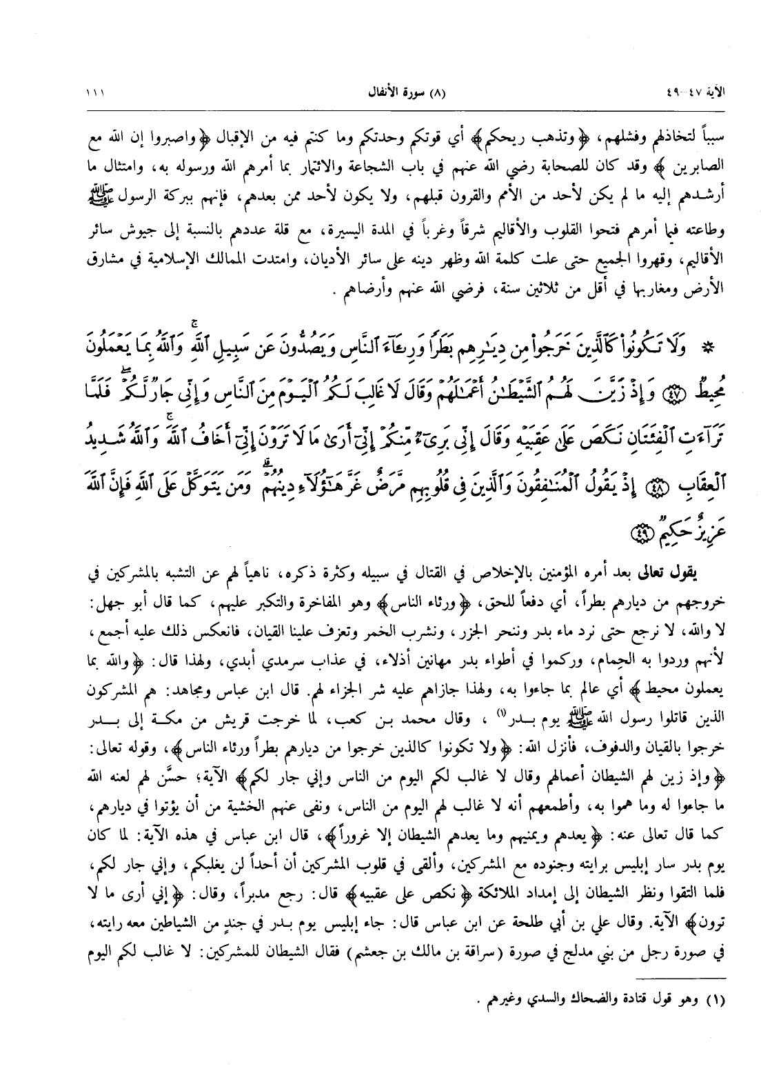 يَقُولُ تَعَالَى بَعْدَ أَمْرِهِ الْمُؤْمِنِينَ بِالْإِخْلَاصِ فِي الْقِتَالِ فِي سَبِيلِهِ وَكَثْرَةِ ذِكْرِهِ، نَاهِيًا لَهُمْ عَنِ التَّشَبُّهِ بِالْمُشْرِكِينَ فِي خُرُوجِهِمْ مِنْ دِيَارِهِمْ بَطَرًا، أَيْ دَفْعًا لِلْحَقِّ، {وَرِئَآءَ النَّاسِ} وَهُوَ الْمُفَاخَرَةُ وَالتَّكَبُّرُ عَلَيْهِمْ، كَمَا قَالَ أَبُو جهل: لَا وَاللَّهِ، لَا نَرْجِعُ حَتَّى نَرِدَ مَاءَ بَدْرٍ وَنَنْحَرَ الْجُزُرَ، وَنَشْرَبَ الْخَمْرَ وَتَعْزِفَ عَلَيْنَا القيان، فانعكس ذلك عليه أجمع، لأنهم وردوا به الحِمام، وركموا في أطواء بدر مهانين أذلاء، فِي عَذَابٍ سَرْمَدِيٍّ أَبَدِيٍّ، وَلِهَذَا قَالَ: {وَاللَّهُ بِمَا يَعْمَلُونَ مُحِيطٌ} أَيْ عَالِمٌ بِمَا جَاءُوا به، ولهذا جازاهم عليه شَرَّ الْجَزَاءِ لَهُمْ. قَالَ ابْنُ عَبَّاسٍ وَمُجَاهِدٌ: هُمُ الْمُشْرِكُونَ الَّذِينَ قَاتَلُوا رَسُولَ اللَّهِ صَلَّى الله عليه وسلم يوم بدر (وهو قول قتادة والضحاك والسدي وغيرهم)، وَقَالَ مُحَمَّدُ بْنُ كَعْبٍ، لَمَّا خَرَجَتْ قُرَيْشٌ مِنْ مَكَّةَ إِلَى بَدْرٍ خَرَجُوا بِالْقِيَانِ وَالدُّفُوفِ، فَأَنْزَلَ اللَّهُ: {وَلاَ تَكُونُواْ كَالَّذِينَ خَرَجُواْ مِن دِيَارِهِم بَطَراً وَرِئَآءَ الناس}، وقوله تعالى: {وَإِذْ زَيَّنَ لَهُمُ الشَّيْطَانُ أَعْمَالَهُمْ وَقَالَ لَا غَالِبَ لَكُمُ الْيَوْمَ مِنَ النَّاسِ وَإِنِّي جَارٌ لَكُمْ} الْآيَةَ؛ حسَّن لَهُمْ لَعَنَهُ اللَّهُ مَا جَاءُوا لَهُ وَمَا هَمُّوا بِهِ، وَأَطْمَعَهُمْ أَنَّهُ لَا غَالِبَ لَهُمُ الْيَوْمَ مِنَ النَّاسِ، وَنَفَى عَنْهُمُ الْخَشْيَةَ مِنْ أَنْ يُؤْتُوا فِي دِيَارِهِمْ، كما قال تَعَالَى عَنْهُ: {يَعِدُهُمْ وَيُمَنِّيهِمْ وَمَا يَعِدُهُمُ الشَّيْطَانُ إِلاَّ غُرُورًا}، قَالَ ابْنُ عَبَّاسٍ فِي هَذِهِ الْآيَةِ: لَمَّا كَانَ يَوْمُ بَدْرٍ سَارَ إِبْلِيسُ بِرَايَتِهِ وَجُنُودِهِ مَعَ الْمُشْرِكِينَ، وَأَلْقَى فِي قُلُوبِ الْمُشْرِكِينَ أَنَّ أَحَدًا لَنْ يَغْلِبَكُمْ، وَإِنِّي جَارٌ لَكُمْ، فَلَمَّا الْتَقَوْا وَنَظَرَ الشَّيْطَانُ إِلَى إِمْدَادِ الْمَلَائِكَةِ {نَكَصَ عَلَى عَقِبَيْهِ} قَالَ: رَجَعَ مُدْبِرًا، وَقَالَ: {إِنِّي أَرَى مَا لَا تَرَوْنَ} الْآيَةَ. وَقَالَ عَلِيُّ بْنُ أَبِي طَلْحَةَ عَنِ ابْنِ عباس قال: جَاءَ إِبْلِيسُ يَوْمَ بَدْرٍ فِي جندٍ مِنَ الشَّيَاطِينِ مَعَهُ رَايَتُهُ، فِي صُورَةِ رَجُلٍ مِنْ بني مدلج فِي صُورَةِ (سُرَاقَةَ بْنِ مَالِكِ بْنِ جُعْشُمٍ) فَقَالَ الشَّيْطَانُ لِلْمُشْرِكِينَ: لَا غَالِبَ لَكُمُ الْيَوْمَ