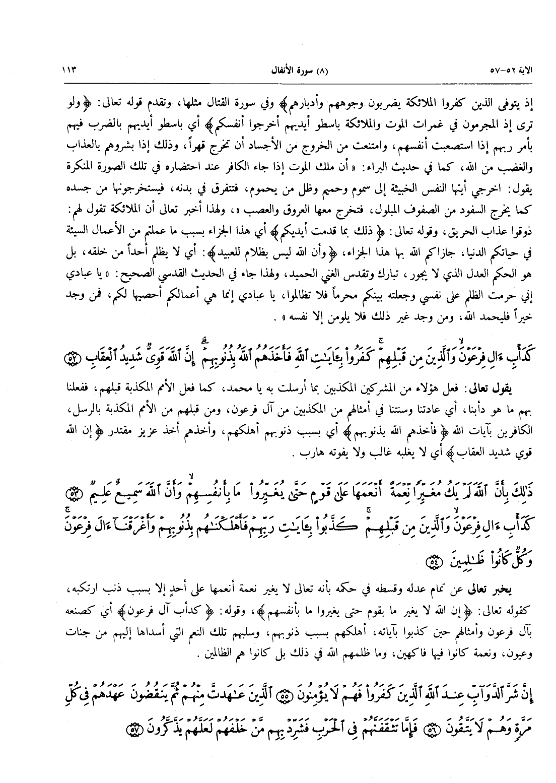 يُخْبِرُ تَعَالَى عَنْ تَمَامِ عَدْلِهِ وَقِسْطِهِ فِي حُكْمِهِ بِأَنَّهُ تَعَالَى لَا يُغَيِّرُ نِعْمَةً أَنْعَمَهَا على أحدٍ إلا بسبب ذنب ارتكبه، كقوله تَعَالَى: {إِنَّ اللَّهَ لاَ يُغَيِّرُ مَا بِقَوْمٍ حَتَّى يُغَيِّرُواْ مَا بِأَنْفُسِهِمْ}، وَقَوْلُهُ: {كَدَأْبِ آلِ فِرْعَوْنَ} أَيْ كَصُنْعِهِ بِآلِ فرعون وأمثالهم حين كذبوا بآياته، لكهم بسبب ذنوبهم وسلبهم تلك النعمة التي أسداها إليهم من جنات وعيون، ونعمة كانوا فاكهينن وَمَا ظَلَمَهُمُ اللَّهُ فِي ذَلِكَ بَلْ كَانُواْ هُمُ الظالمين.