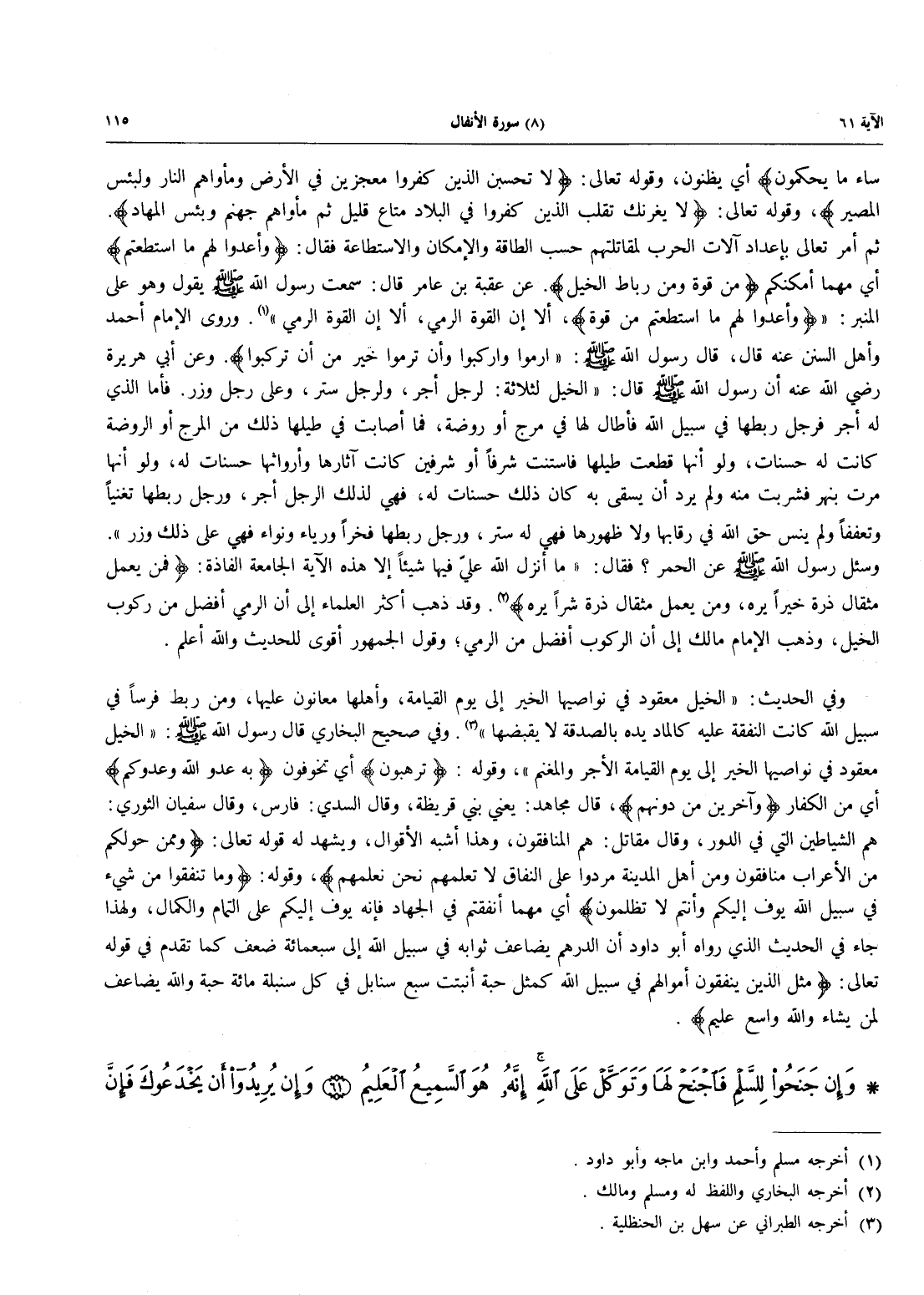 سَآءَ مَا يَحْكُمُونَ} أي يظنون، وقوله تَعَالَى: {لاَ تَحْسَبَنَّ الَّذِينَ كَفَرُواْ مُعْجِزِينَ فِي الْأَرْضِ وَمَأْوَاهُمُ النار وَلَبِئْسَ المصير}، وقوله تَعَالَى: {لاَ يَغُرَّنَّكَ تَقَلُّبُ الَّذِينَ كَفَرُواْ فِي الْبِلَادِ مَتَاعٌ قَلِيلٌ ثُمَّ مَأْوَاهُمْ جَهَنَّمُ وَبِئْسَ الْمِهَادُ}. ثُمَّ أَمَرَ تَعَالَى بِإِعْدَادِ آلَاتِ الْحَرْبِ لِمُقَاتَلَتِهِمْ حَسَبَ الطَّاقَةِ وَالْإِمْكَانِ وَالِاسْتِطَاعَةِ فَقَالَ: {وَأَعِدُّواْ لَهُمْ مَّا اسْتَطَعْتُمْ} أَيْ مَهْمَا أَمْكَنَكُمْ {مِّن قُوَّةٍ وَمِن رِّبَاطِ الخيل}. عن عقبة بْنِ عَامِرٍ قَالَ: سَمِعْتُ رَسُولَ اللَّهِ صَلَّى اللَّهُ عَلَيْهِ وَسَلَّمَ يَقُولُ وَهُوَ عَلَى الْمِنْبَرِ: «وَأَعِدُّواْ لَهُمْ مَّا اسْتَطَعْتُمْ مِّن قُوَّةٍ}، أَلَا إِنَّ الْقُوَّةَ الرمي، إلا إن القوة الرمي» (أخرجه مسلم وأحمد وابن ماجه وأبو داود). وَرَوَى الْإِمَامُ أَحْمَدُ وَأَهْلُ السُّنَنِ عَنْهُ قَالَ، قَالَ رَسُولُ اللَّهِ صَلَّى اللَّهُ عَلَيْهِ وَسَلَّمَ: «ارْمُوا وَارْكَبُوا وَأَنْ تَرْمُوا خَيْرٌ مِنْ أَنْ تركبوا». وَعَنْ أَبِي هُرَيْرَةَ رَضِيَ اللَّهُ عَنْهُ أَنَّ رَسُولَ الله صلى الله عليه وسلم قال: "الْخَيْلُ لِثَلَاثَةٍ: لِرَجُلٍ أَجْرٌ، وَلِرَجُلٍ سِتْرٌ، وَعَلَى رَجُلٍ وِزْرٌ. فَأَمَّا الَّذِي لَهُ أَجْرٌ فَرَجُلٌ رَبَطَهَا فِي سَبِيلِ اللَّهِ فَأَطَالَ لَهَا فِي مَرْجٍ أَوْ رَوْضَةٍ، فَمَا أَصَابَتْ فِي طِيَلِهَا ذَلِكَ مِنَ الْمَرْجِ أَوْ الرَّوْضَةِ كَانَتْ لَهُ حَسَنَاتٌ،
