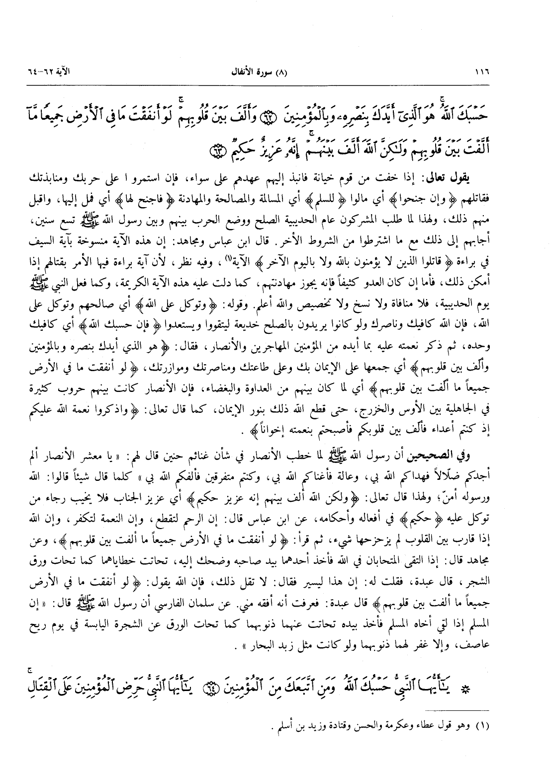 يَقُولُ تَعَالَى: إِذَا خِفْتَ مِن قَوْمٍ خِيَانَةً فَانْبِذْ إِلَيْهِمْ عَهْدَهُمْ عَلَى سَوَاءٍ، فَإِنِ اسْتَمَرُّوا عَلَى حَرْبِكَ وَمُنَابِذَتِكَ فَقَاتِلْهُمْ {وَإِن جَنَحُواْ} أَيْ مَالُوا {لِلسَّلْمِ} أَيْ الْمُسَالَمَةِ وَالْمُصَالَحَةِ وَالْمُهَادَنَةِ {فَاجْنَحْ لَهَا} أَيْ فَمِلْ إِلَيْهَا، وَاقْبَلْ مِنْهُمْ ذَلِكَ، وَلِهَذَا لَمَّا طَلَبَ الْمُشْرِكُونَ عَامَ الْحُدَيْبِيَةِ الصُّلْحَ وَوَضْعَ الْحَرْبِ بَيْنَهُمْ وَبَيْنَ رَسُولِ اللَّهِ صَلَّى اللَّهُ عَلَيْهِ وَسَلَّمَ تِسْعَ سِنِينَ، أَجَابَهُمْ إِلَى ذَلِكَ مع ما اشترطوا من الشروط الأخر. قال ابن عباس ومجاهد: إِنَّ هَذِهِ الْآيَةَ مَنْسُوخَةٌ بِآيَةِ السَّيْفِ فِي بَرَاءَةَ {قَاتِلُواْ الَّذِينَ لاَ يُؤْمِنُونَ بِاللَّهِ وَلاَ بِالْيَوْمِ الآخر} الآية (وهو قول عطاء وعكرمة والحسن وقتادة وزيد بن أسلم)، وفيه نظر، لِأَنَّ آيَةَ بَرَاءَةَ فِيهَا الْأَمْرُ بِقِتَالِهِمْ إِذَا أمكن ذلك، فَأَمَّآ إِن كَانَ العدو كثيفاً فإنه يجوز مهادنتهم، كما دلت هَذِهِ الْآيَةُ الْكَرِيمَةُ، وَكَمَا فَعَلَ النَّبِيُّ صَلَّى اللَّهُ عَلَيْهِ وَسَلَّمَ يَوْمَ الْحُدَيْبِيَةِ، فَلَا مُنَافَاةَ وَلَا نَسْخَ وَلَا تَخْصِيصَ واللَّهُ أَعْلَمُ. وَقَوْلُهُ: {وَتَوَكَّلْ عَلَى اللَّهِ} أَيْ صَالِحْهُمْ وَتَوَكَّلَ عَلَى اللَّهِ، فَإِنَّ اللَّهَ كَافِيكَ وَنَاصِرُكَ وَلَوْ كَانُوا يُرِيدُونَ بِالصُّلْحِ خَدِيعَةً لِيَتَقَوَّوْا وَيَسْتَعِدُّوا {فَإِنَّ حَسْبَكَ اللَّهُ} أَيْ كَافِيكَ وَحْدَهُ، ثُمَّ ذَكَرَ نِعْمَتَهُ عليه بما أيده مِنَ الْمُؤْمِنِينَ الْمُهَاجِرِينَ وَالْأَنْصَارِ، فَقَالَ: {هُوَ الَّذِي أَيَّدَكَ بِنَصْرِهِ وَبِالْمُؤْمِنِينَ وَأَلَّفَ بَيْنَ قُلُوبِهِمْ} أَيْ جَمَعَهَا عَلَى الْإِيمَانِ بِكَ وَعَلَى طَاعَتِكَ وَمُنَاصَرَتِكَ وَمُوَازَرَتِكَ، {لَوْ أَنفَقْتَ مَّا فِي الْأَرْضِ جَمِيعاً مَّآ أَلَّفَتْ بَيْنَ قُلُوبِهِمْ} أَيْ لِمَا كَانَ بَيْنَهُمْ مِنَ الْعَدَاوَةِ وَالْبَغْضَاءِ، فَإِنَّ الْأَنْصَارَ كَانَتْ بَيْنَهُمْ حُرُوبٌ كَثِيرَةٌ فِي الْجَاهِلِيَّةِ بَيْنَ الْأَوْسِ والخزرج، حَتَّى قَطَعَ اللَّهُ ذَلِكَ بِنُورِ الْإِيمَانِ، كَمَا قَالَ تَعَالَى: {وَاذْكُرُوا نِعْمَةَ اللَّهِ عَلَيْكُمْ إِذْ كُنْتُمْ أَعْدَآءً فَأَلَّفَ بَيْنَ قُلُوبِكُمْ فَأَصْبَحْتُمْ بِنِعْمَتِهِ إِخْوَاناً}.