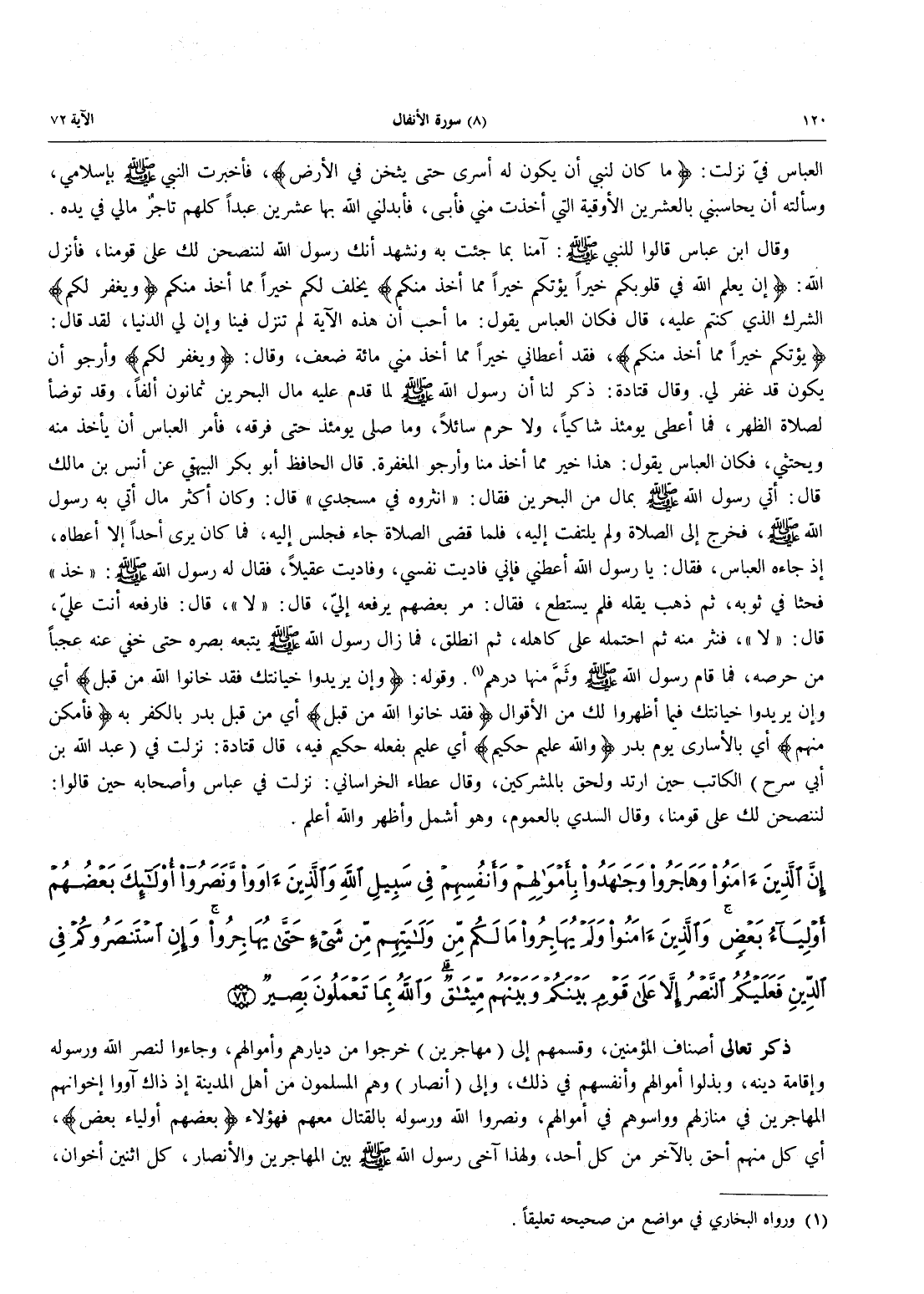 الْعَبَّاسُ فِيَّ نَزَلَتْ: {مَا كَانَ لِنَبِيٍّ أَنْ يَكُونَ لَهُ أَسْرَى حَتَّى يُثْخِنَ فِي الْأَرْضِ}، فَأَخْبَرْتُ النَّبِيَّ صَلَّى اللَّهُ عَلَيْهِ وَسَلَّمَ بِإِسْلَامِي، وسألته أن يحاسبني بالعشرين الأوقية التي أخذت مِنِّي فَأَبَى، فَأَبْدَلَنِي اللَّهُ بِهَا عِشْرِينَ عَبْدًا كُلُّهُمْ تاجرٌ مَالِي فِي يَدِهِ.