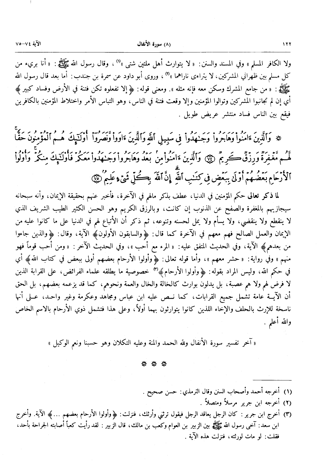 لَمَّا ذَكَرَ تَعَالَى حُكْمَ الْمُؤْمِنِينَ فِي الدُّنْيَا، عَطَفَ بِذِكْرِ مَا لَهُمْ فِي الْآخِرَةِ، فَأَخْبَرَ عَنْهُمْ بحقية الإيمان، وأنه سبحانه سيجازيهم بالمغفرة والصفح عن الذنوب إِنْ كَانَتْ، وَبِالرِّزْقِ الْكَرِيمِ وَهُوَ الْحَسَنُ الْكَثِيرُ الطيب الشريف الذي لَا يَنْقَطِعُ وَلَا يَنْقَضِي، وَلَا يُسْأَمُ وَلَا يُمَلُّ لِحُسْنِهِ وَتَنَوُّعِهِ، ثُمَّ ذَكَرَ أَنَّ الْأَتْبَاعَ لَهُمْ فِي الدُّنْيَا عَلَى مَا كَانُوا عَلَيْهِ مِنَ الإيمانُ وَالْعَمَلِ الصَّالِحِ فَهُمْ مَعَهُمْ فِي الآخرة كما قال: {والسابقون الأولون} الآية، وقال: {والذين جَآءُوا مِن بَعْدِهِمْ} الآية، وفي الحديث المتفق عليه: «الْمَرْءُ مَعَ مَنْ أَحَبَّ»، وَفِي الْحَدِيثِ الْآخَرِ: «ومن أحب قوماً فهو منهم» وفي رواية: «حشر معهم»، وَأَمَّا قَوْلُهُ تَعَالَى: {وَأْوْلُواْ الْأَرْحَامِ بَعْضُهُمْ أَوْلَى بِبَعْضٍ فِي كِتَابِ اللَّهِ} أَيْ فِي حُكْمِ الله، وليس المراد بقوله: {وَأْوْلُواْ الأرحام} (أخرج ابن جرير: كان الرجل يعاقد الرجل فيقول ترثني وأرثك، فنزلت: {وَأْوْلُواْ الأرحام بَعْضُهُمْ ... } الآية، وأخرج ابن سعد: آخَى رَسُولُ اللَّهِ صَلَّى اللَّهُ عَلَيْهِ وَسَلَّمَ بَيْنَ الزبير بن العوام وكعب بن مالك، قال الزبير: لقد رأيت كعباً أصابته الجراحة بأحد، فقلت: لو مات لورثته، فنزلت هذه الآية) خُصُوصِيَّةَ مَا يُطْلِقُهُ عُلَمَاءُ الْفَرَائِضِ، عَلَى الْقَرَابَةِ الَّذِينَ لَا فَرْضَ لَّهُمْ وَلاَ هُمْ عَصَبَةٌ، بل يدلون بوارث كالخالة والخال والعمة ونحوهم، كما قد يزعمه بعضهم، بَلِ الْحَقُّ أَنَّ الْآيَةَ عَامَّةٌ تَشْمَلُ جَمِيعَ القرابات، كما نص عليه ابن عباس ومجاهد وعكرمة وَغَيْرُ وَاحِدٍ، عَلَى أَنَّهَا نَاسِخَةٌ لِلْإِرْثِ بِالْحِلْفِ والإخاء اللذين كانوا يتوارثون بهما أولاً، وَعَلَى هَذَا فَتَشْمَلُ ذَوِي الْأَرْحَامِ بِالِاسْمِ الْخَاصِّ والله أعلم.