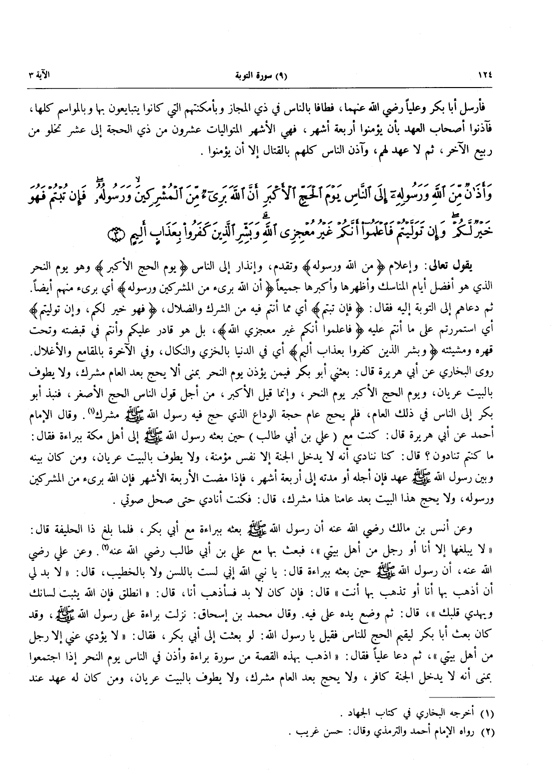 يَقُولُ تَعَالَى: وَإِعْلَامٌ {مِّنَ اللَّهِ وَرَسُولِهِ} وَتَقَدُّمٌ، وَإِنْذَارٌ إِلَى النَّاسِ {يَوْمَ الْحَجِّ الْأَكْبَرِ} وَهُوَ يَوْمُ النَّحْرِ الَّذِي هو أفضل أيام المناسك وأظهرها وأكبرها جميعاً {أَنَّ اللَّهَ بَرِيءٌ مِنَ الْمُشْرِكِينَ وَرَسُولُهُ} أَيْ بَرِيءٌ مِنْهُمْ أَيْضًا. ثُمَّ دَعَاهُمْ إِلَى التَّوْبَةِ إِلَيْهِ فَقَالَ: {فَإِن تُبْتُمْ} أَيْ مِمَّا أَنْتُمْ فِيهِ مِنَ الشِّرْكِ وَالضَّلَالِ، {فَهُوَ خَيْرٌ لَّكُمْ، وَإِن تَوَلَّيْتُمْ} أَيِ اسْتَمْرَرْتُمْ عَلَى مَآ أَنْتُمْ عَلَيْهِ {فَاعْلَمُوا أَنَّكُمْ غَيْرُ مُعْجِزِي اللَّهِ}، بَلْ هو قادر عليكم وَأَنْتُمْ فِي قَبْضَتِهِ وَتَحْتَ قَهْرِهِ وَمَشِيئَتِهِ {وَبَشِّرِ الَّذِينَ كَفَرُواْ بِعَذَابٍ أَلِيمٍ} أَيْ فِي الدُّنْيَا بالخزي والنكال، وفي الآخرة بالمقامع والأغلال. روى البخاري عن أبي هريرة قال: بعثني أبو بكر يؤذن فيمن يؤذن يوم النحر بِمِنَى أَلَّا يَحُجَّ بَعْدَ الْعَامِ مُشْرِكٌ، وَلَا يَطُوفُ بِالْبَيْتِ عُرْيَانٌ، وَيَوْمُ الْحَجِّ الْأَكْبَرِ يَوْمُ النَّحْرِ، وَإِنَّمَا قِيلَ الْأَكْبَرُ، مِنْ أَجْلِ قَوْلِ النَّاسِ الْحَجُّ الْأَصْغَرُ، فَنَبَذَ أَبُو بَكْرٍ إِلَى النَّاسِ فِي ذَلِكَ الْعَامِ، فَلَمْ يَحُجَّ عَامَ حَجَّةِ الْوَدَاعِ الَّذِي حَجَّ فِيهِ رَسُولُ اللَّهِ صَلَّى اللَّهُ عَلَيْهِ وَسَلَّمَ مشرك (أخرجه البخاري في كتاب الجهاد). وقال الإمام أحمد عن أبي هريرة قَالَ: كُنْتُ مَعَ (عَلِيِّ بْنِ أَبِي طَالِبٍ) حِينَ بَعَثَهُ رَسُولُ اللَّهِ صَلَّى اللَّهُ عَلَيْهِ وَسَلَّمَ إِلَى أَهْلِ مَكَّةَ بِبَرَاءَةَ فَقَالَ: مَا كنتم تنادون؟ قال: كنا ننادي أنه لَا يَدْخُلُ الْجَنَّةَ إِلَّا نَفْسٌ مُؤْمِنَةٌ، وَلَا يطوف بالبيت عريان، ومن كان بينه وَبَيْنَ رَسُولِ اللَّهِ صَلَّى اللَّهُ عَلَيْهِ وَسَلَّمَ عَهْدٌ فإن أجله أو مدته إِلَى أَرْبَعَةِ أَشْهُرٍ، فَإِذَا مَضَتِ الْأَرْبَعَةُ الْأَشْهُرُ فَإِنَّ اللَّهَ بَرِيءٌ مِنَ الْمُشْرِكِينَ وَرَسُولُهُ، وَلَا يحج هذا البيت بعد عامنا هذا مُشْرِكٌ، قَالَ: فَكُنْتُ أُنَادِي حَتَّى صَحِلَ صَوْتِي.