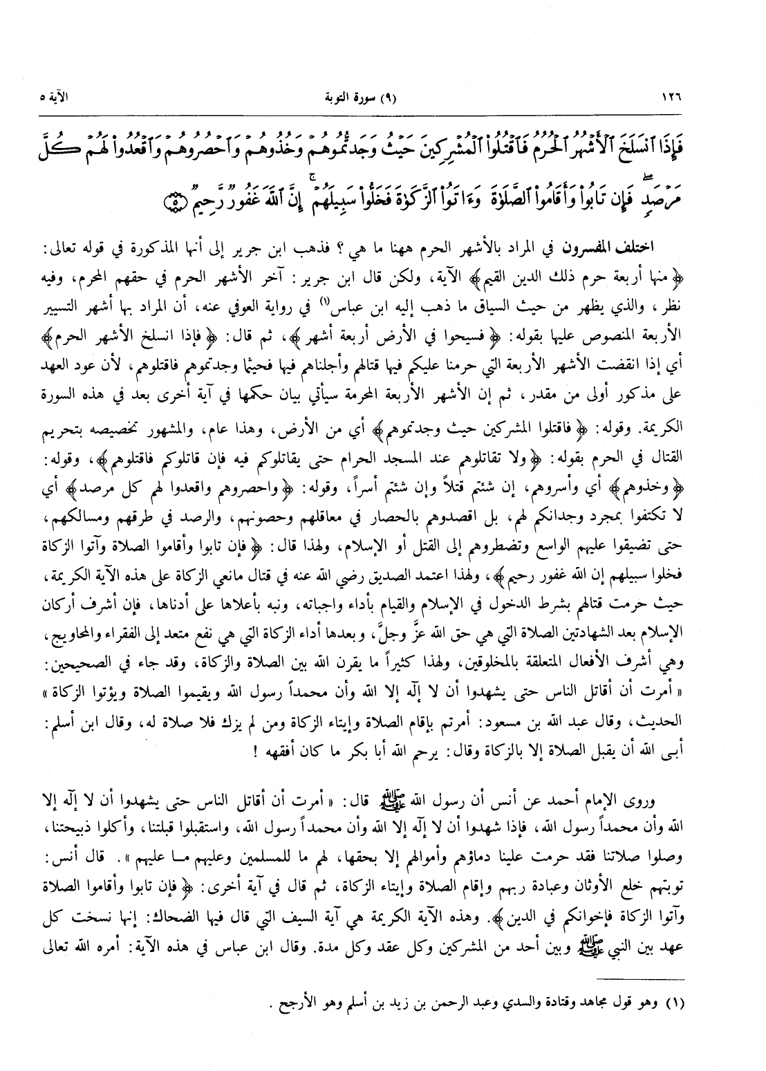 اخْتَلَفَ الْمُفَسِّرُونَ في المراد بالأشهر الحرم ههنا مَا هِيَ؟ فَذَهَبَ ابْنُ جَرِيرٍ إِلَى أَنَّهَا المذكروة فِي قَوْلِهِ تَعَالَى: {مِنْهَا أَرْبَعَةٌ حُرُمٌ ذَلِكَ الدين القيم} الآية، ولكن قَالَ ابْنُ جَرِيرٍ: آخِرُ الْأَشْهُرِ الْحُرُمِ فِي حقهم المحرم، وَفِيهِ نَظَرٌ، وَالَّذِي يَظْهَرُ مِنْ حَيْثُ السِّيَاقِ ما ذهب إليه ابن عباس (وهو قول مجاهد وقَتَادَةُ وَالسُّدِّيُّ وَعَبْدُ الرَّحْمَنِ بْنُ زَيْدِ بْنِ أَسْلَمَ وهو الأرجح) في رواية العوفي عنه، أَنَّ الْمُرَادَ بِهَا أَشْهُرُ التَّسْيِيرِ الْأَرْبَعَةِ الْمَنْصُوصِ عليها بقوله: {فَسِيحُواْ فِي الأرض أربعة أشهر}، ثُمَّ قَالَ: {فَإِذَا انْسَلَخَ الْأَشْهُرُ الْحُرُمُ} أَيْ إِذَا انْقَضَتِ الْأَشْهُرُ الْأَرْبَعَةُ الَّتِي حَرَّمْنَا عَلَيْكُمْ فِيهَا قِتَالَهُمْ وَأَجَّلْنَاهُمْ فِيهَا فَحَيْثُمَا وَجَدْتُمُوهُمْ فَاقْتُلُوهُمْ، لِأَنَّ عَوْدَ الْعَهْدِ عَلَى مَذْكُورٍ أَوْلَى مِنْ مُقَدَّرٍ، ثُمَّ إِنَّ الْأَشْهُرَ الْأَرْبَعَةَ الْمُحَرَّمَةَ سَيَأْتِي بَيَانُ حُكْمِهَا فِي آيَةٍ أُخرى بَعْدُ فِي هَذِهِ السُّورَةِ الْكَرِيمَةِ. وَقَوْلُهُ: {فَاقْتُلُوا الْمُشْرِكِينَ حَيْثُ وَجَدتُّمُوهُمْ} أَيْ مِنَ الْأَرْضِ، وَهَذَا عَامٌّ، وَالْمَشْهُورُ تَخْصِيصُهُ بِتَحْرِيمِ الْقِتَالِ فِي الْحَرَمِ بِقَوْلِهِ: {وَلاَ تُقَاتِلُوهُمْ عِنْدَ الْمَسْجِدِ الْحَرَامِ حَتَّى يُقَاتِلُوكُمْ فِيهِ فَإِن قَاتَلُوكُمْ فاقتلوهم}، وَقَوْلُهُ: {وَخُذُوهُمْ} أَيْ وَأْسِرُوهُمْ، إِنْ شِئْتُمْ قَتْلًا وَإِنْ شِئْتُمْ أَسْرًا، وَقَوْلُهُ: {وَاحْصُرُوهُمْ وَاقْعُدُوا لَهُمْ كُلَّ مَرْصَدٍ} أَيْ لَا تَكْتَفُوا بِمُجَرَّدِ وِجْدَانِكُمْ لَهُمْ، بَلِ اقْصِدُوهُمْ بِالْحِصَارِ فِي مَعَاقِلِهِمْ وَحُصُونِهِمْ، وَالرَّصْدِ فِي طُرُقِهِمْ وَمَسَالِكِهِمْ، حَتَّى تُضَيِّقُوا عَلَيْهِمُ الْوَاسِعَ وَتَضْطَرُّوهُمْ إِلَى الْقَتْلِ أَوِ الْإِسْلَامِ، وَلِهَذَا قَالَ: {فَإِن تَابُواْ وَأَقَامُواْ الصَّلَاةَ وَآتَوُاْ الزَّكَاةَ فَخَلُّواْ سَبِيلَهُمْ إِنَّ اللَّهَ غَفُورٌ رَّحِيمٌ}، وَلِهَذَا اعْتَمَدَ الصِّدِّيقُ رَضِيَ اللَّهُ عَنْهُ فِي قِتَالِ مانعي الزكاة على هذه الآية الكريمة، حيث حرمت قتالهم بشرط الدُّخُولُ فِي الْإِسْلَامِ وَالْقِيَامُ بِأَدَاءِ وَاجِبَاتِهِ، وَنَبَّهَ بأعلاها على أدناها، فإن أشرف أركان الإسلام بعد الشهادتين الصَّلَاةُ الَّتِي هِيَ حَقُّ اللَّهِ عزَّ وجلَّ، وَبَعْدَهَا أَدَاءُ الزَّكَاةِ الَّتِي هِيَ نَفْعٌ مُتَعَدٍّ إِلَى الْفُقَرَاءِ وَالْمَحَاوِيجِ، وَهِيَ أَشْرَفُ الْأَفْعَالِ الْمُتَعَلِّقَةِ بِالْمَخْلُوقِينَ، وَلِهَذَا كَثِيرًا مَا يَقْرِنُ اللَّهُ بَيْنَ الصلاة والزكاة، وقد جاء في الصحيحين: «أُمِرْتُ أَنْ أُقَاتِلَ النَّاسَ حَتَّى يَشْهَدُوا أَنْ لَا إِلَهَ إِلَّا اللَّهُ وَأَنَّ مُحَمَّدًا رَسُولُ اللَّهِ وَيُقِيمُوا الصَّلَاةَ وَيُؤْتُوا الزَّكَاةَ» الْحَدِيثَ، وَقَالَ عبد الله ابن مسعود: أمرتم بلإقام الصَّلَاةِ وَإِيتَاءِ الزَّكَاةِ وَمَنْ لَمْ يُزَكِّ فَلَا صلاة له، وقال ابن أَسْلَمَ: أَبَى اللَّهُ أَنْ يَقْبَلَ الصَّلَاةَ إِلَّا بالزكاة وقال: يرحم الله ما كان أفقهه!